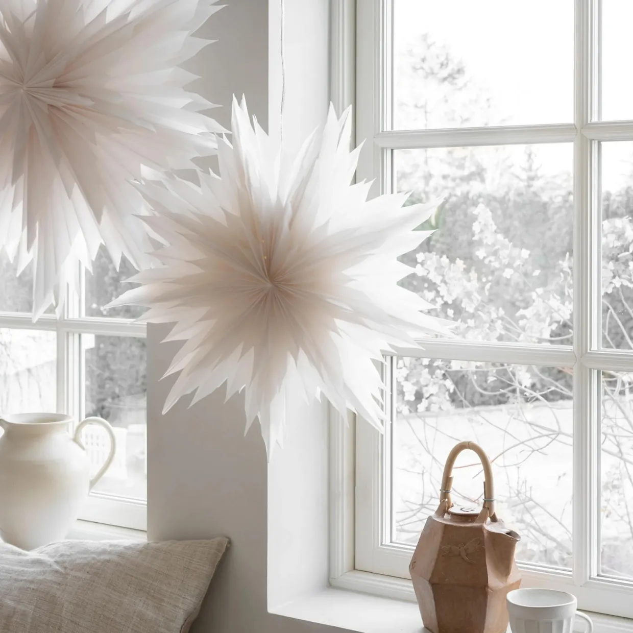 Oslo julstjärna Ø60 cm från Watt & Veke är en sprakande pappersstjärna som likt Norges sagolika fjordar och magiska fjäll skapar ett dramatiskt ljusspel. Adventsstjärnan är omsorgsfullt vikt för hand i halvtransparent papper av högsta kvalité och skapar ett mjukt och elegant uttryck i fönstret.
