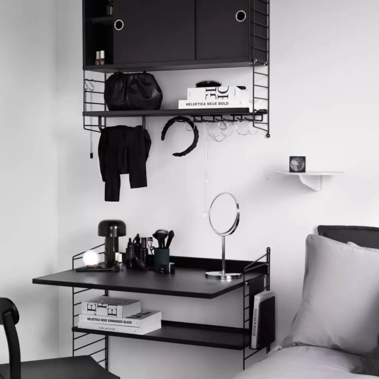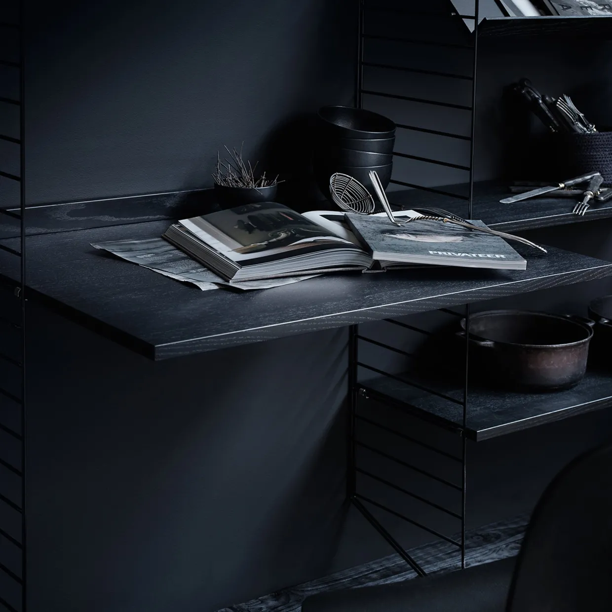 Fixa till arbetsrummet med din egen skräddarsydda Stringhylla. Med den här arbetsskivan i ekfanér får du en smidig skrivbordsplats.