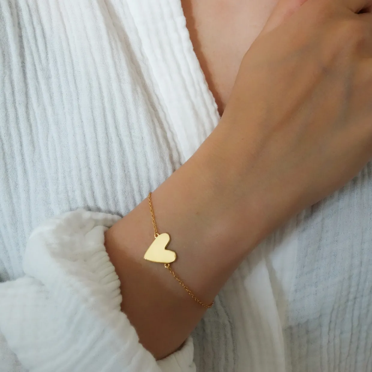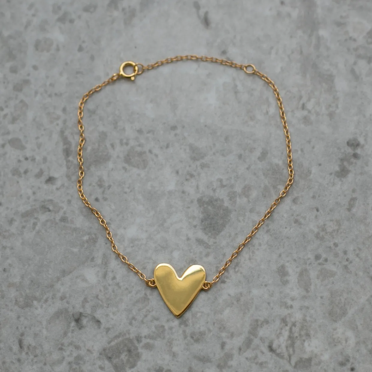 Armband Freja med hjärtberlock i guldpläterat silver. Freja är ett armband att bära varje dag med en enkel, stilren berlock i form av ett hjärta som påminner om kärlek, styrka och närvaro. Den mjuka formen och den tidlösa designen gör det lika fint till vardag som till fest och passar de flesta stilar.