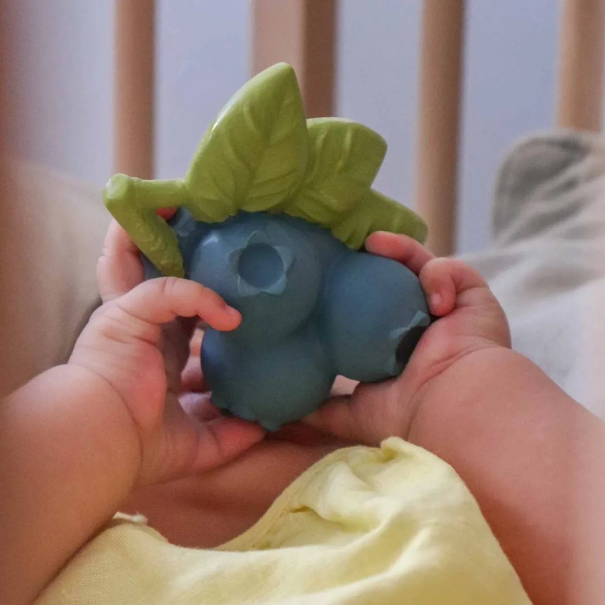 Jerry the Blueberry är en bitvänlig babyleksak för tandsprickning, badstunder och sensorisk lek.