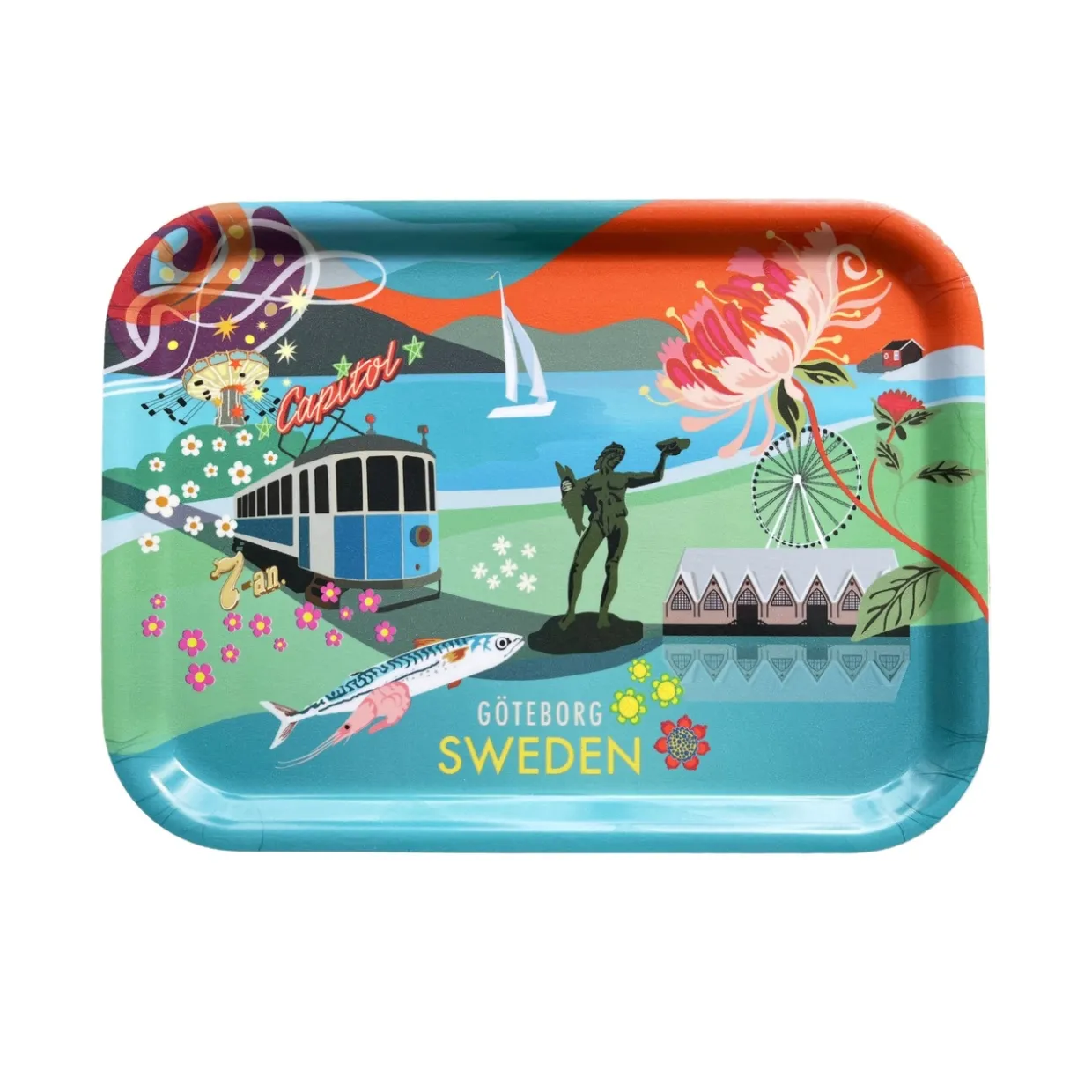 En praktisk och vacker bricka med ett färgstarkt Göteborgmotiv, illustrerat av Lottis Karlsson. Med sin lekfulla stil lyfter Lottis fram stadens unika karaktär genom noggrant utvalda symboler och detaljer som speglar känslan av Göteborg.