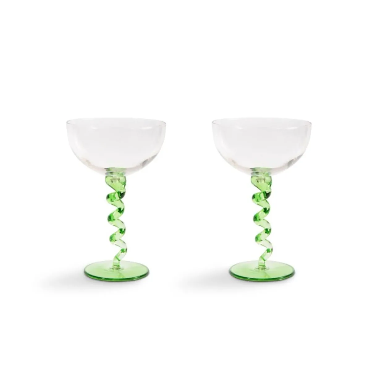 Två stycken vackra, festliga champagneglas med en spiralformad, grön fot. Glasen passar lika bra till champagne eller annan dryck som till efterrätter och glass. Tack vare den ljusa enfärgade gröna färgen och en intressant vriden fot livar dessa glas upp vilket bord som helst!