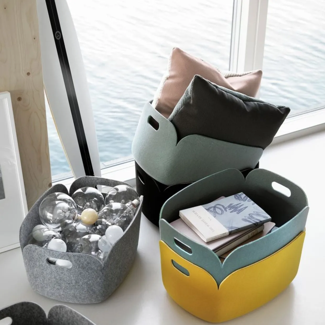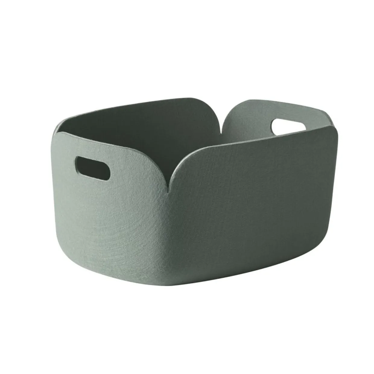 Praktisk, mjuk och följsam förvaringskorg för tidningar och papper, tillverkad av filt från återvunna PET-flaskor. Formgiven av Mika Tolvanen för Muuto.