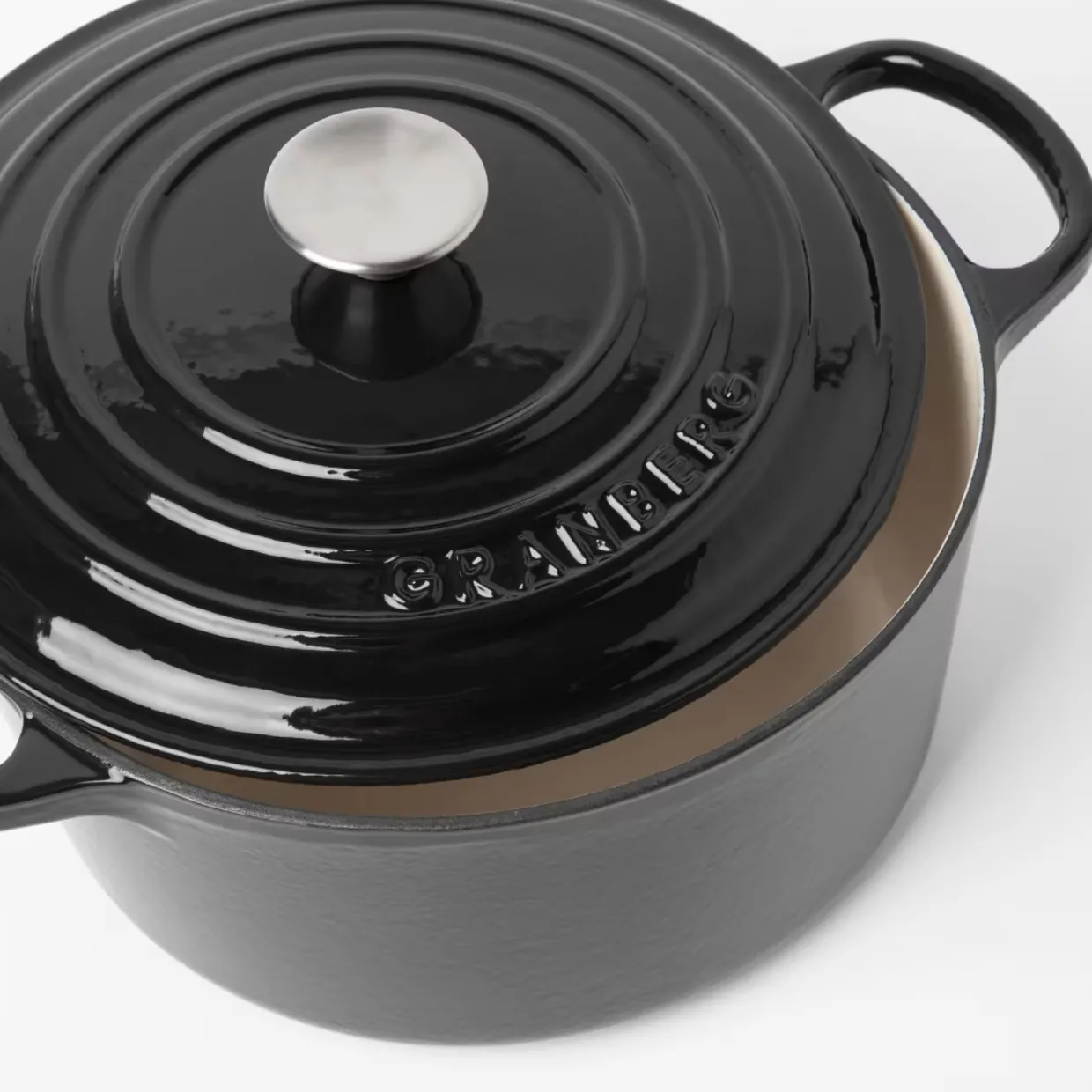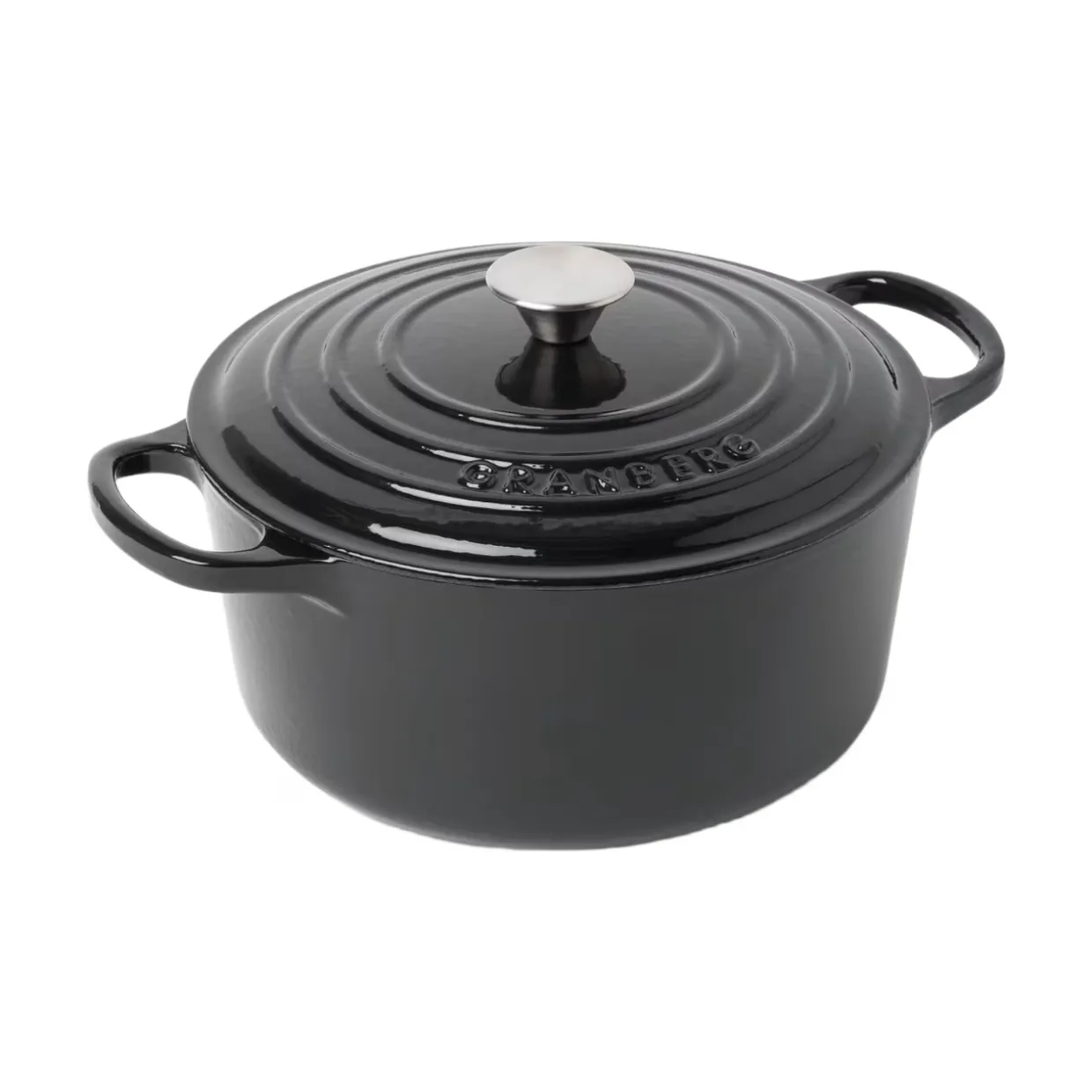 Gedigen gryta i emaljerat gjutjärn som fördelar värmen jämnt och håller den kvar länge. Bra för matlagning som kräver en hög och jämn temperatur så som grytor och stekar.