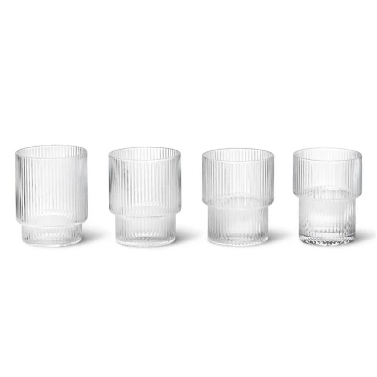 4-pack med munblåsta dricksglas från Ferm Living. De fyra glasen har alla olika geometriska former och en vackert räfflad yta i klarglas. De vertikala räfflorna ger ett starkt och sofistikerat utseende och de varierade geometriska formerna skapar dynamik och energi mellan glasen.