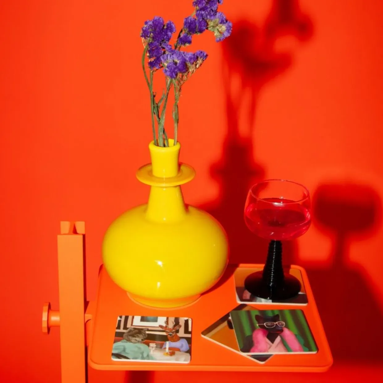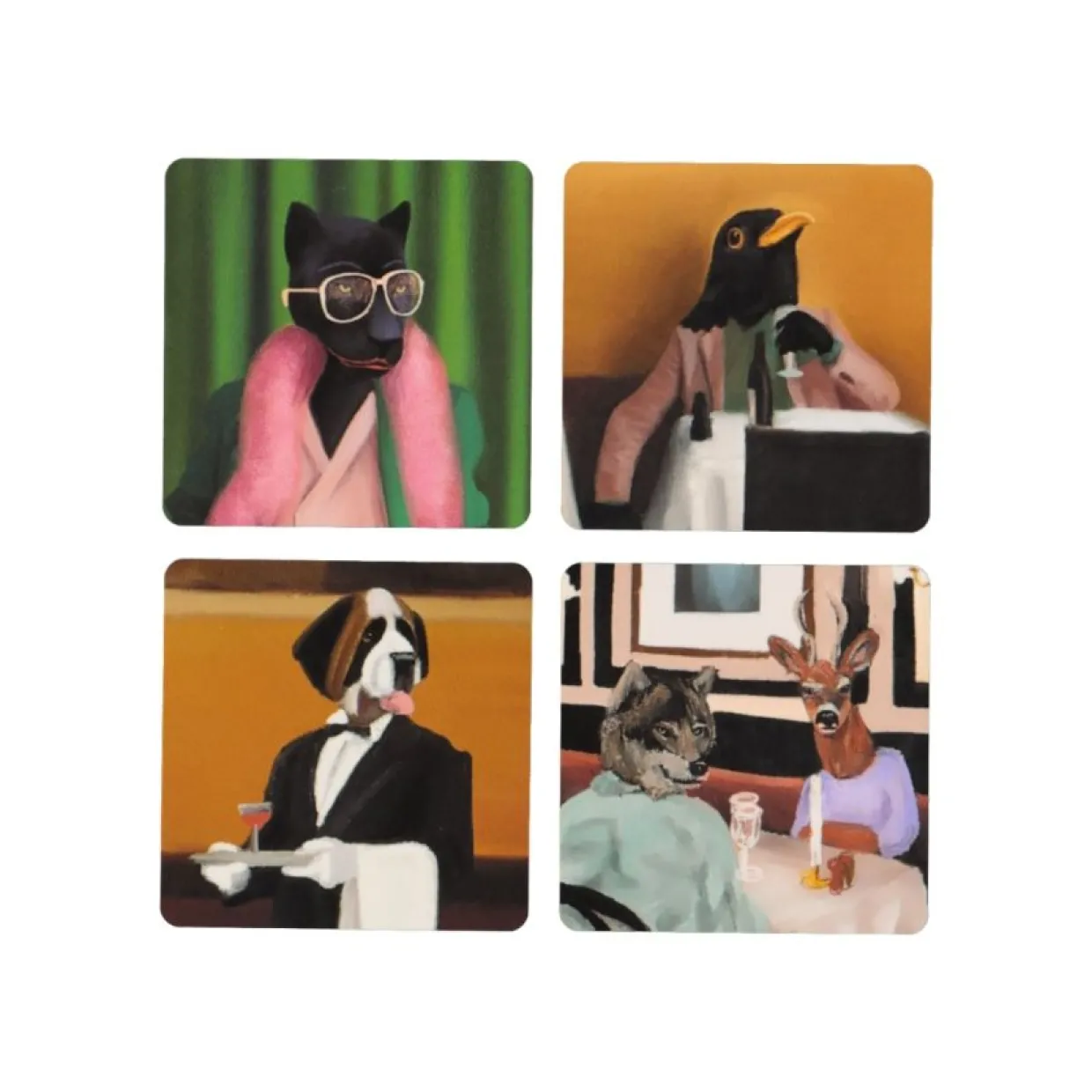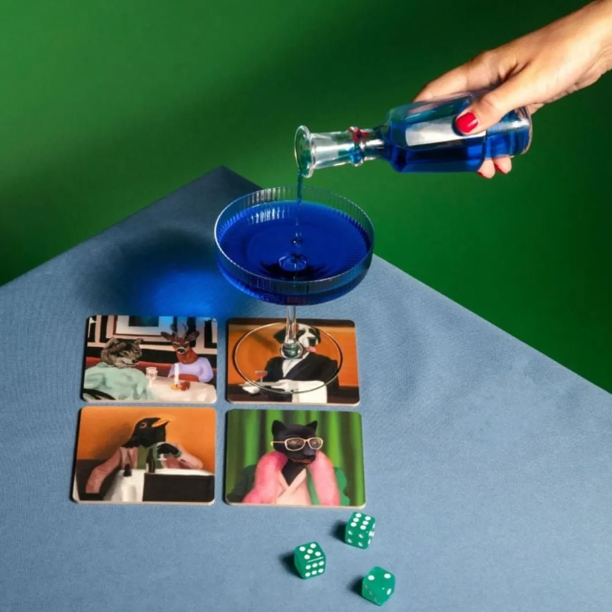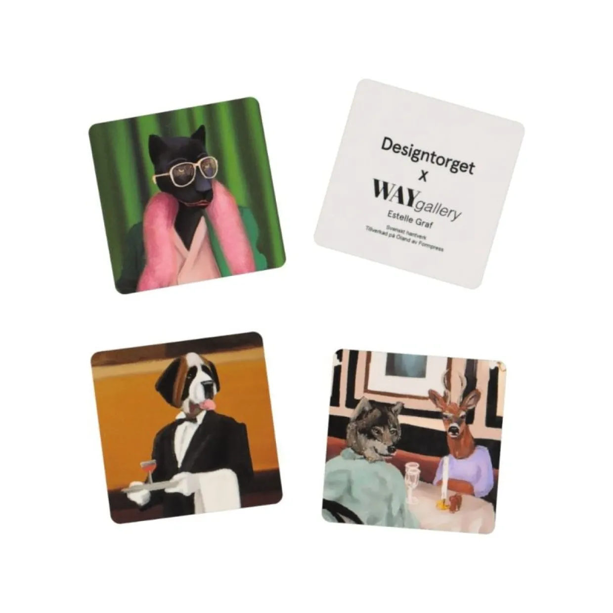 ”Illustrationerna som utgör min del av kollektionen är en fortsättning på min nu ganska stora samling målningar av fabler. Med djurhuvuden på människokroppar gestaltar jag karaktärer som inte sällan befinner sig i olika restaurangermiljöer – något som kändes perfekt för illustrationer tänkta till drinkunderlägg och serveringsbrickor som är några av de föremål jag designat till kollektionen.”