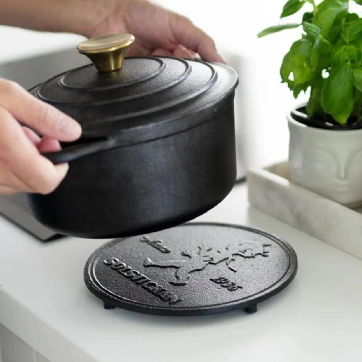 Skydda ditt bord och din arbetsyta med detta dekorativa grytunderlägg i gjutjärn från Solstickan Design. En vacker dekoration i köket och en perfekt inflyttningspresent. Underlägget har 4st gummi fötter som skyddar underlaget.
