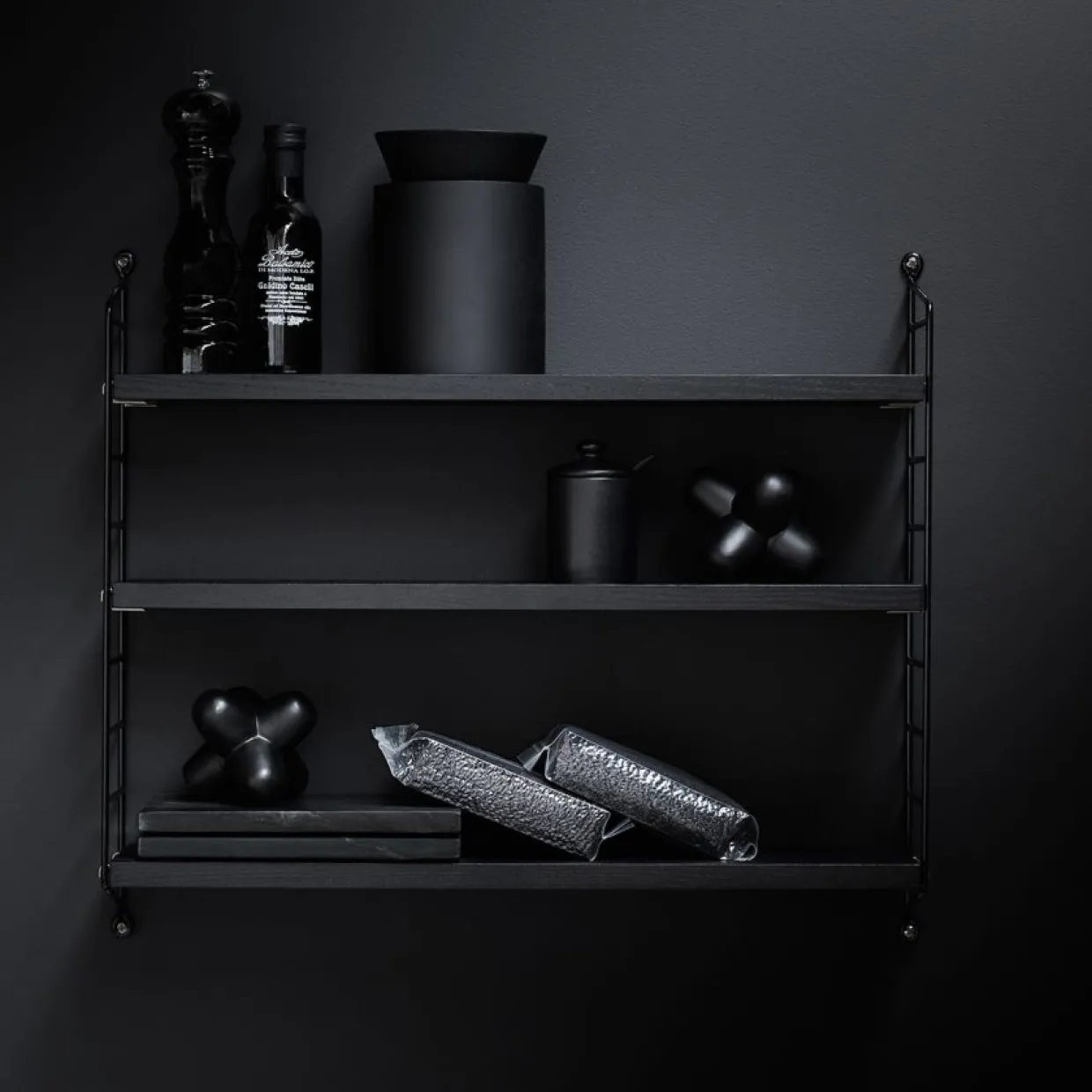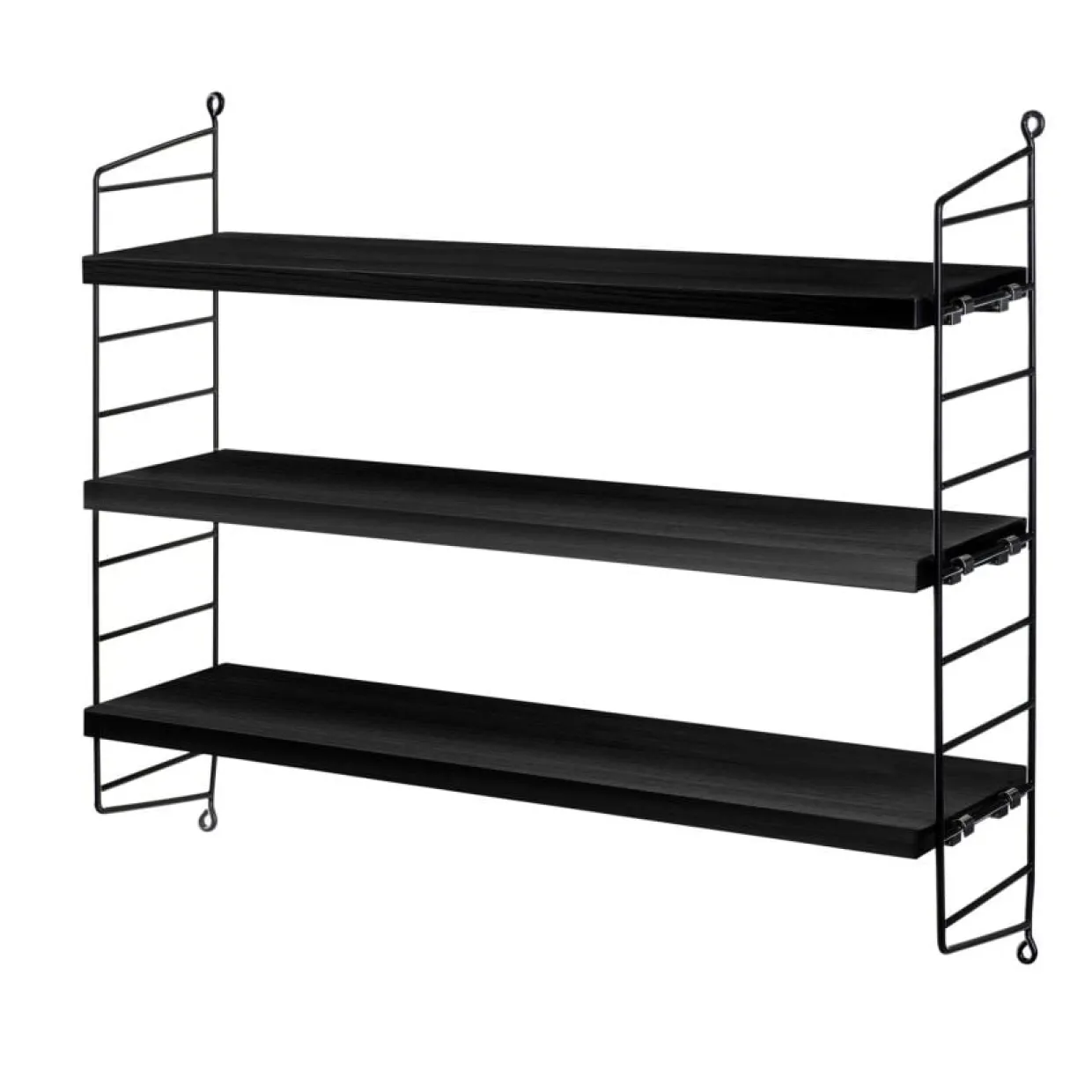 Denna pockethylla har svarta hyllplan och svarta gavlar.