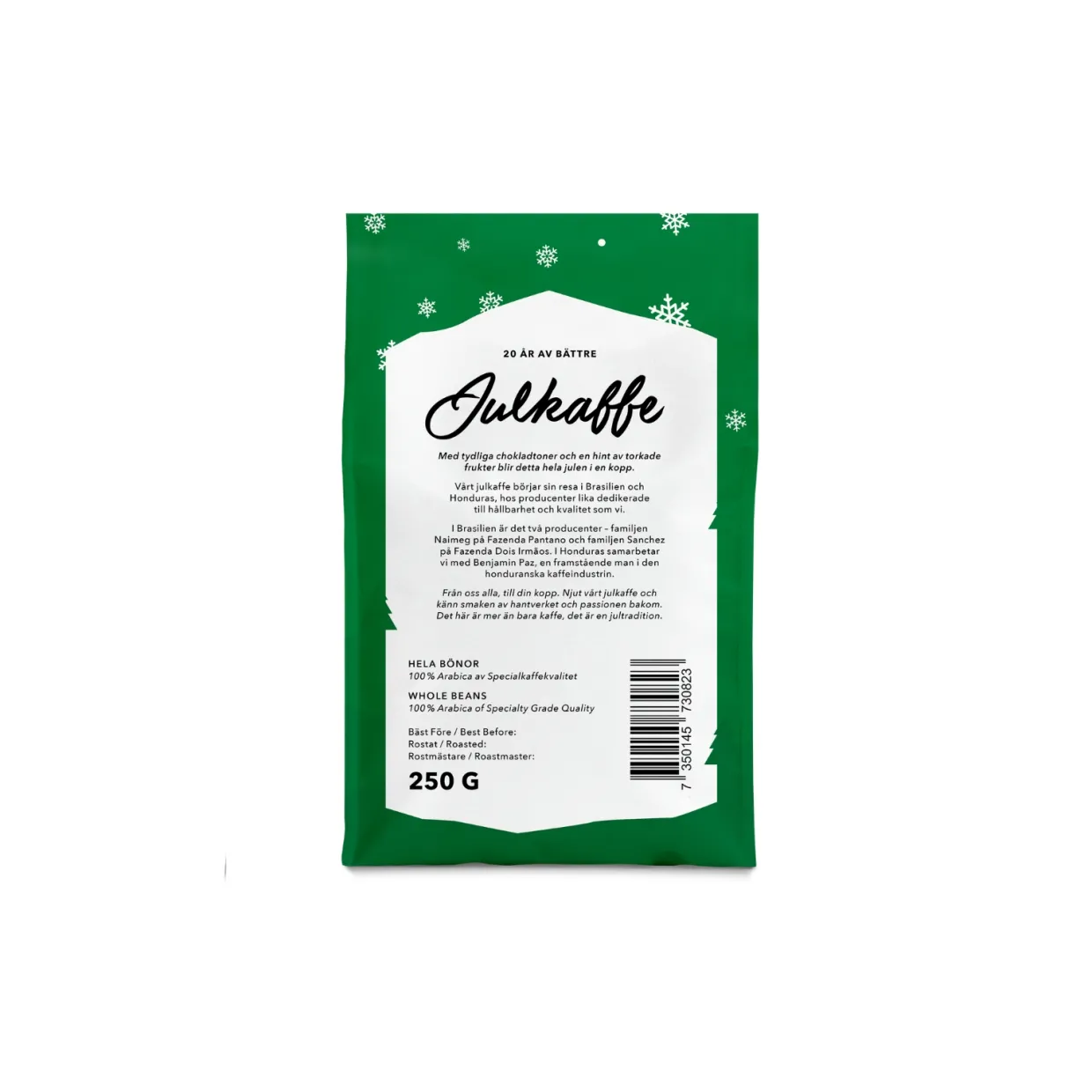 Julkaffe med tydliga chokladtoner och en hint av torkade frukter blir detta hela julen i en kopp. Från oss alla, till din kopp. Njut vårt julkaffe och känn smaken av hantverket och passionen bakom. Det här är mer än bara kaffe, det är en jultradition.