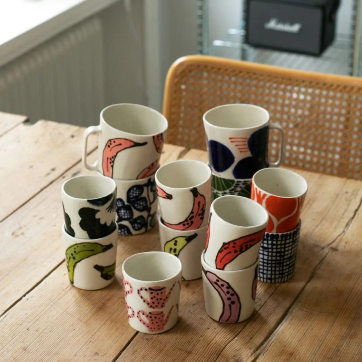 Anna Broström Ek har skapat denna fina kollektion av koppar som är perfekt för kaffe. Muggarna görs av stockholmsbaserade Anna Broström Ek som främst arbetar med handmålat bruksgods. Produkterna är dekorerade med hennes typiska färgglada motiv och är tänkt att kombineras för att skapa egna unika kollektioner, mixa och matcha med kaffekopparna i samma kollektion!