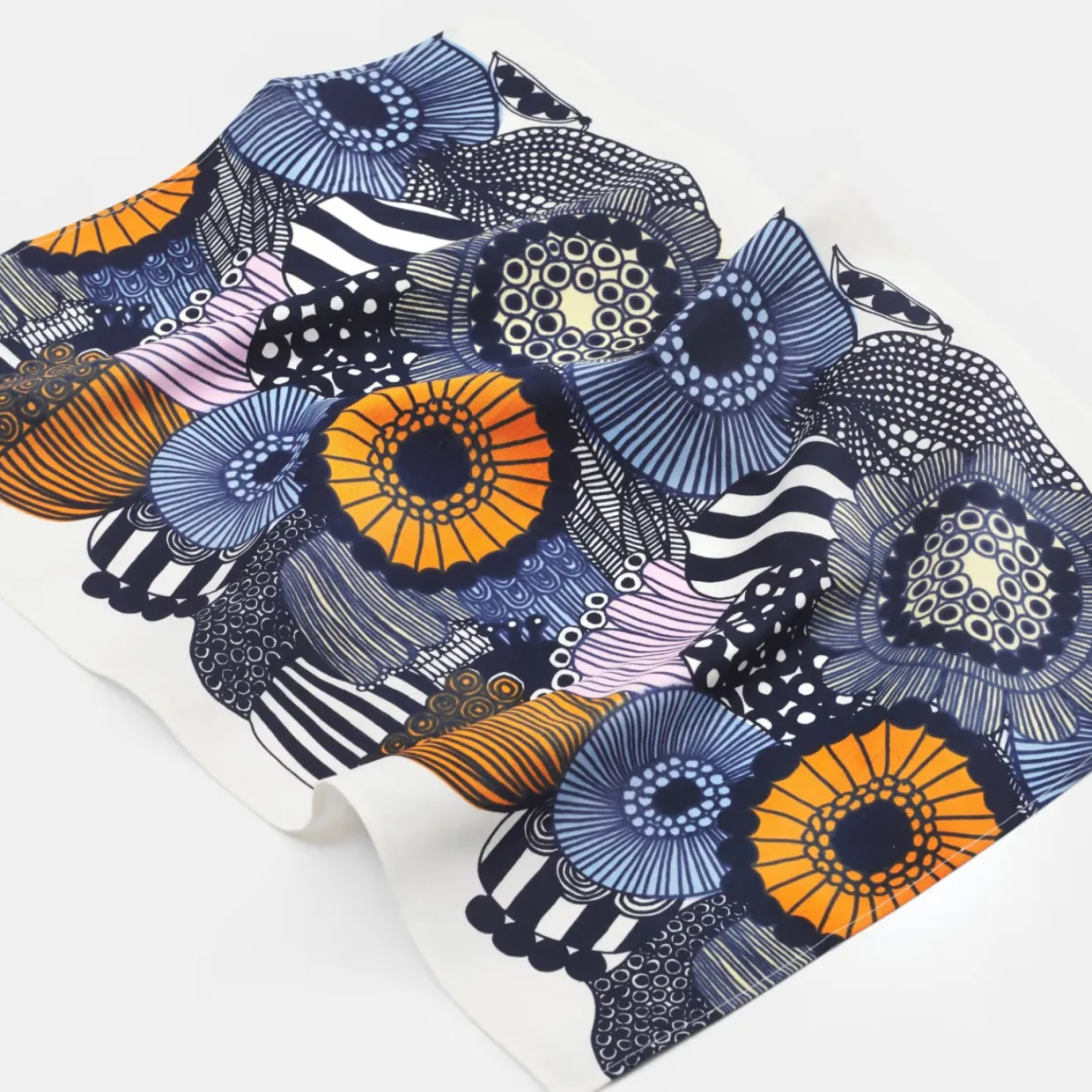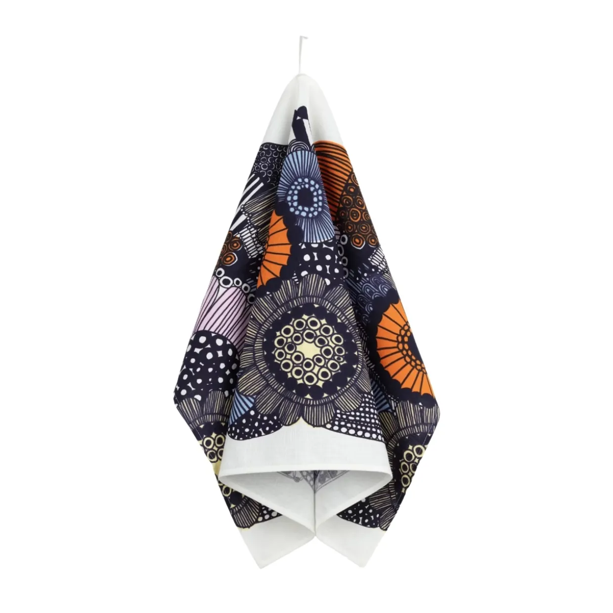 Kökshandduken med mönstret Siirtolapuutarha är tillverkad av en blandning av bomull och linne och är tryckt i Helsingfors. Handduken har en grön picotkant och en hängögla på den långa sidan.