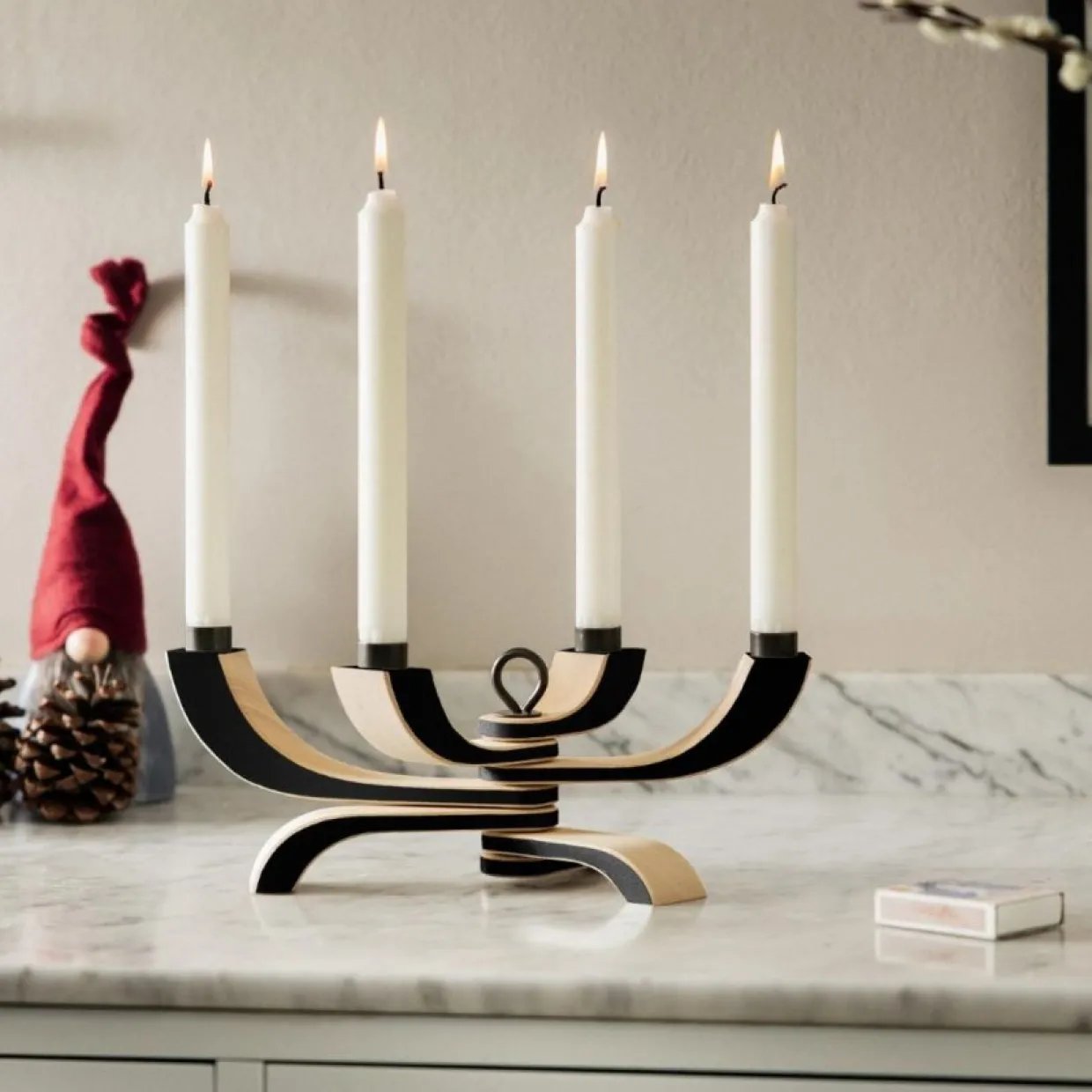 4-armad ljusstake där du själv bestämmer formen. Använd den fullt utfälld, delvis ihopfälld eller helt ihopfälld! Vrid sedan om skruven i mitten. Formgiven av Jonas Grundell för Design House Stockholm. Finns även som sjuarmad ljusstake.