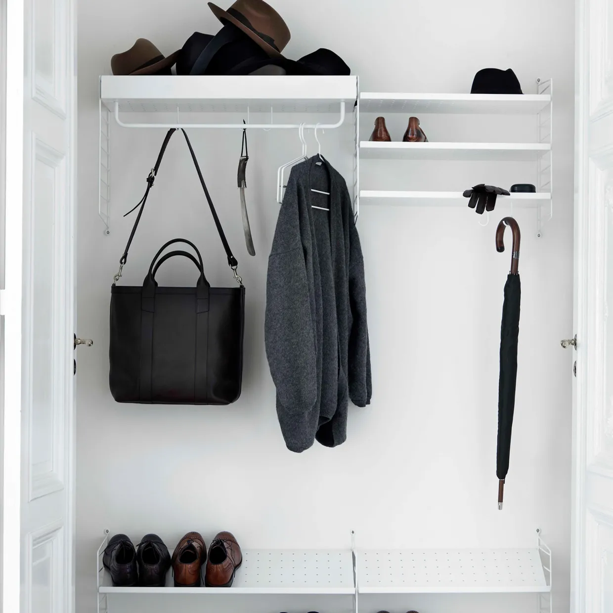 Robust Stringhyllplan i grå strukturlackad perforerad metall, perfekt till köket eller hallen. Formgiven av Anna von Schewen & Björn Dahlström för String Furniture.
