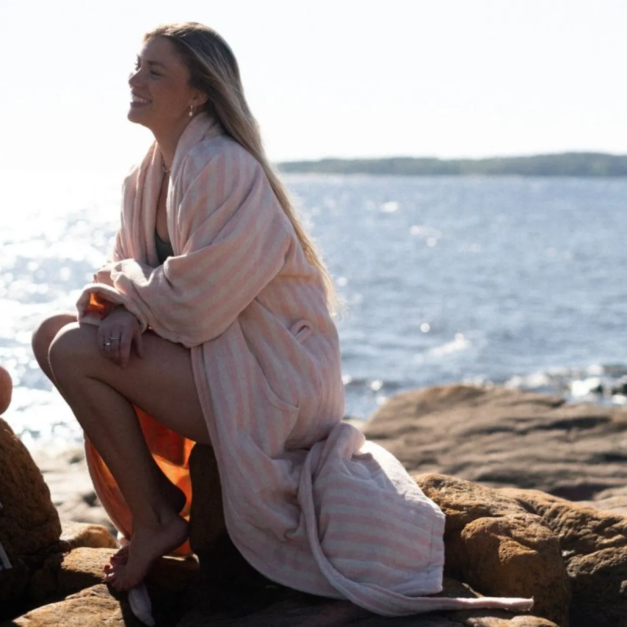 Badrocken Naram har en klassisk men modern design med fina färger och ränder. Badrocken kommer med sjalkrage, öppen front, bältesstängning och två rymliga fickor – perfekt för avslappnade morgnar eller bara hemmamys i soffan.