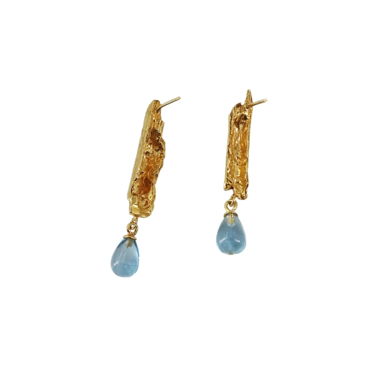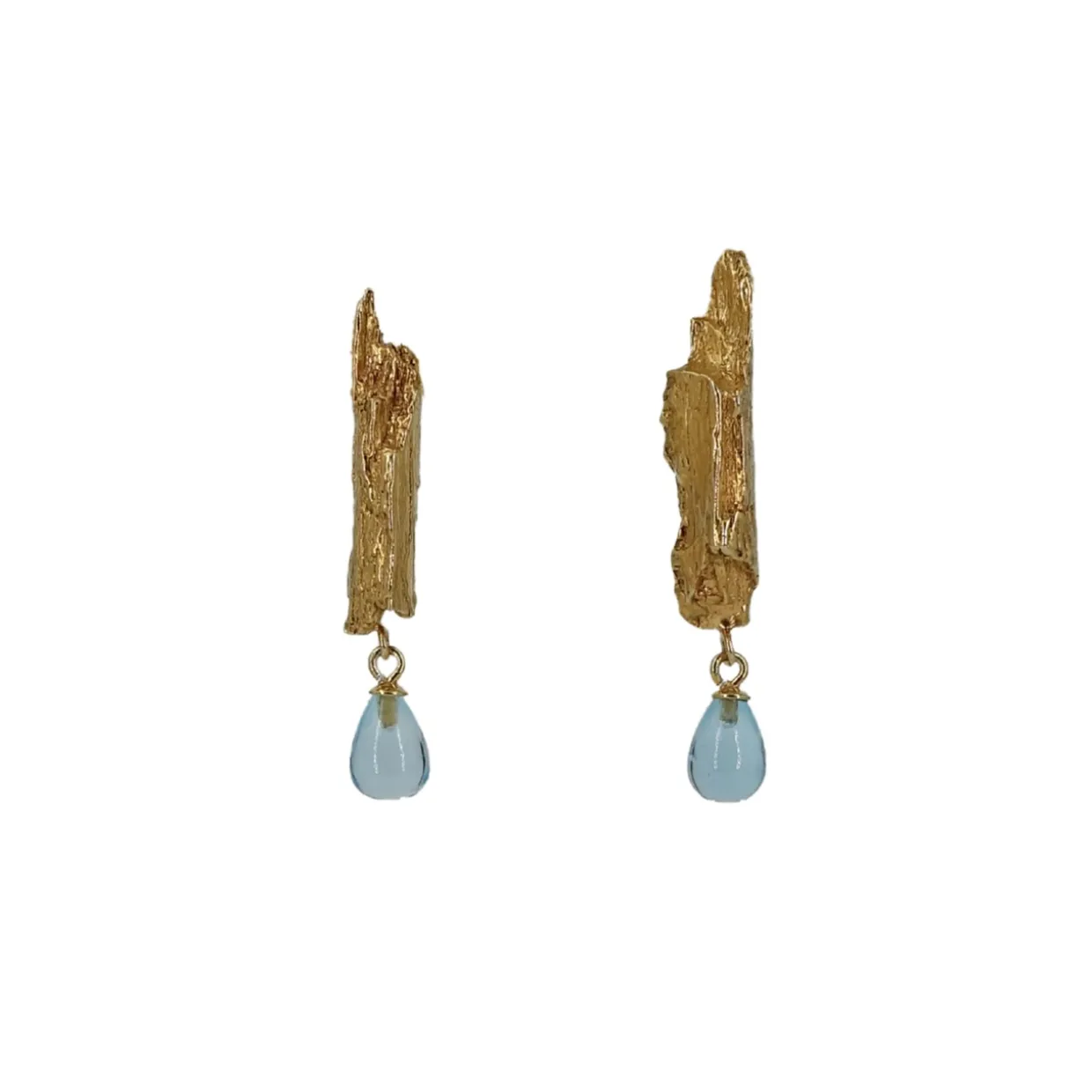 En stilla hyllning till naturens kraft, där varje smycke bär spår av trädens tysta styrka och vattnets mjuka flöde. Smyckena fångar naturens mönster – från grenarnas förgreningar till vattnets dans – och speglar livets eviga rörelse. Handgjorda med omsorg för den som vill bära naturens viskningar nära sitt hjärta. Dessa örhängen är tillverkade för hand i Sverige av återvunnet silver och förgyllda med 24K guld. De är också prydda med ett vackert par av naturliga topasstenar i en mjuk blå nyans. Natur Kollektion: Barkens Röst Örhängen.