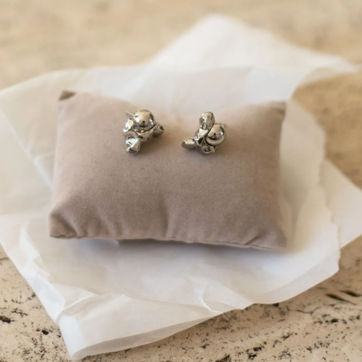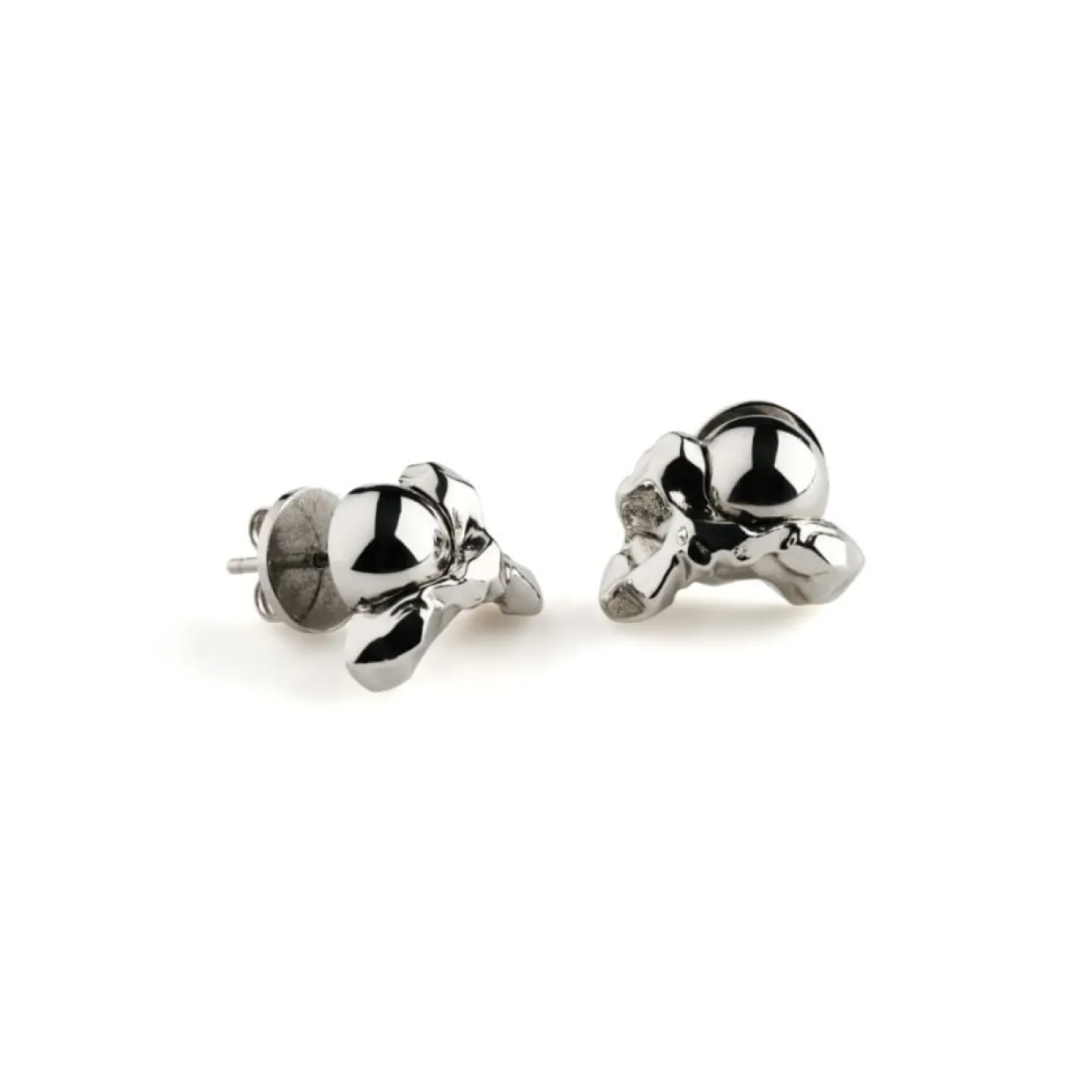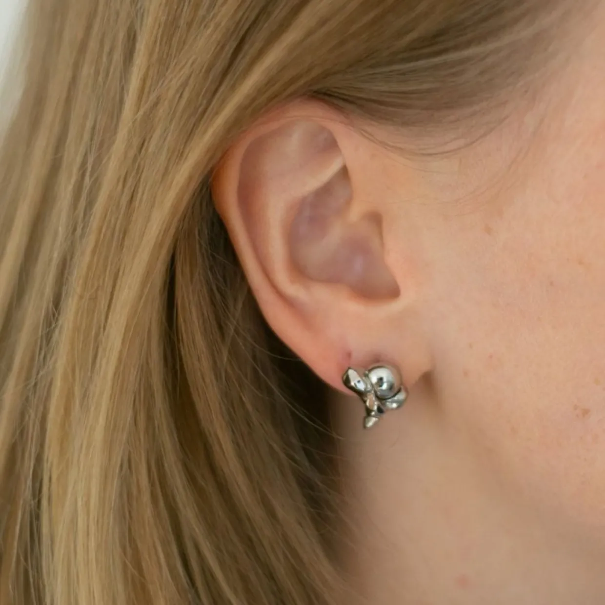Ett litet stiftörhänge, med en blank halvkula och en strukturdel i silverfärgat stål. Det är kombinationen av den släta blanka kulan och den strukturerade delen som skapar ett intressant och unikt uttryck. Örhängena kan med fördel kombineras med den matchande ringen i samma kollektion.