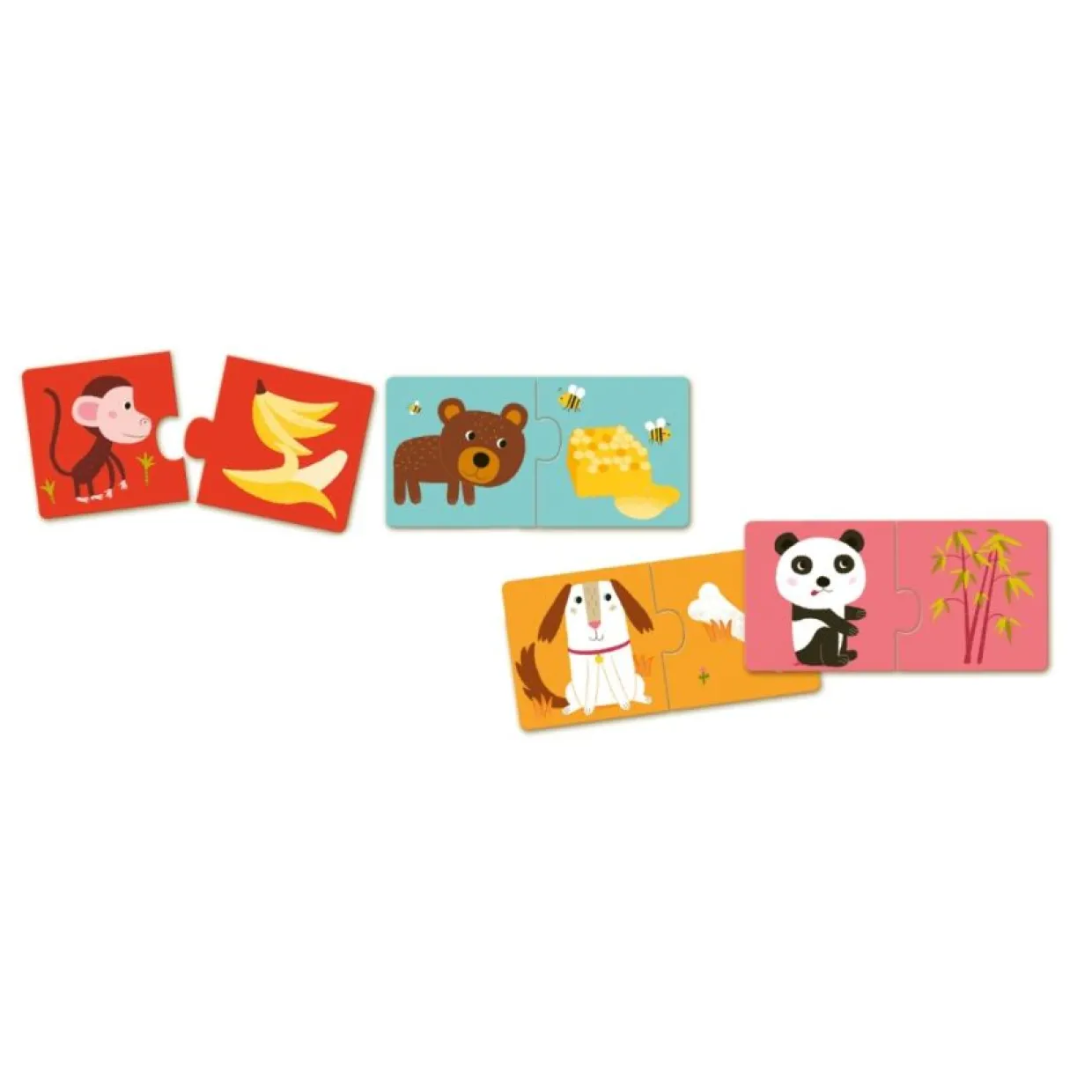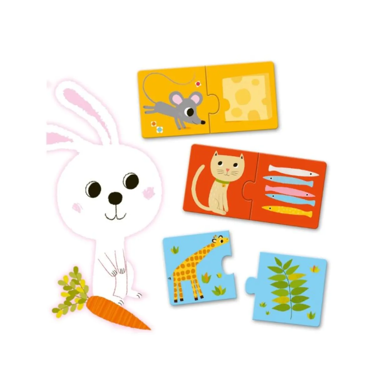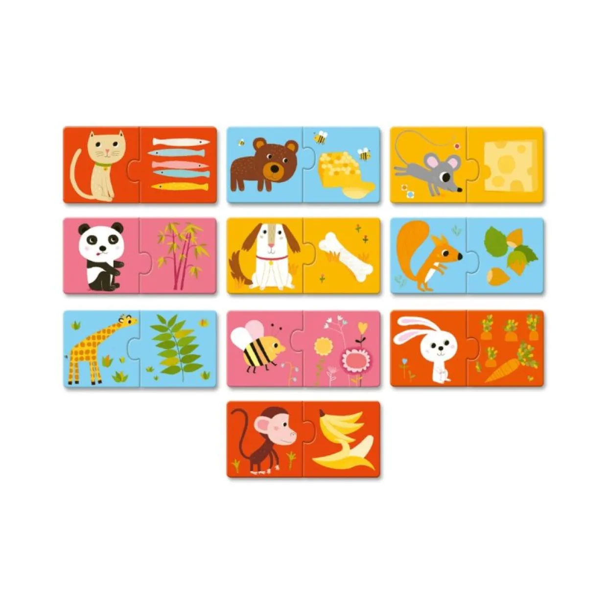 Ett set med 10 fint illustrerade små 2-bitars pussel där de yngsta barnen ska försöka koppla ihop olika djur med vad det äter. Förpackningen innehåller 10 olika pussel av kraftig, FSC®️ certifierad kartong med två bitar var och är själv-korrigerande då varje bit bara passar ihop med sin partner. De 20 pusselbitarna är förpackade i en färggrann låda med ett handtag av snöre som gör det enkelt att bära med sig boxen, även för de minsta. Från +2 år.