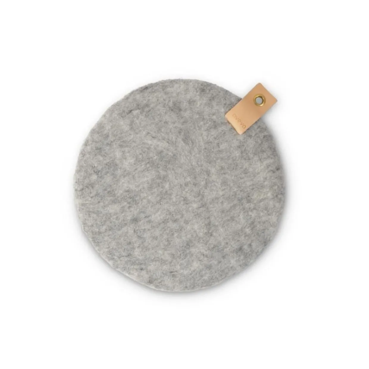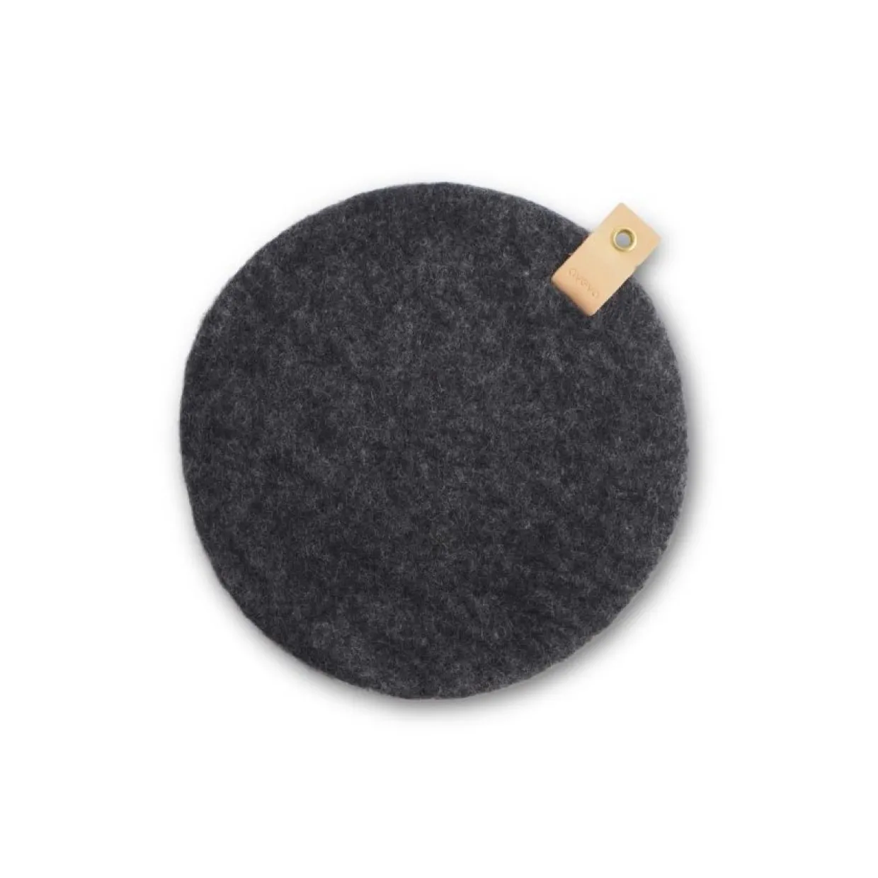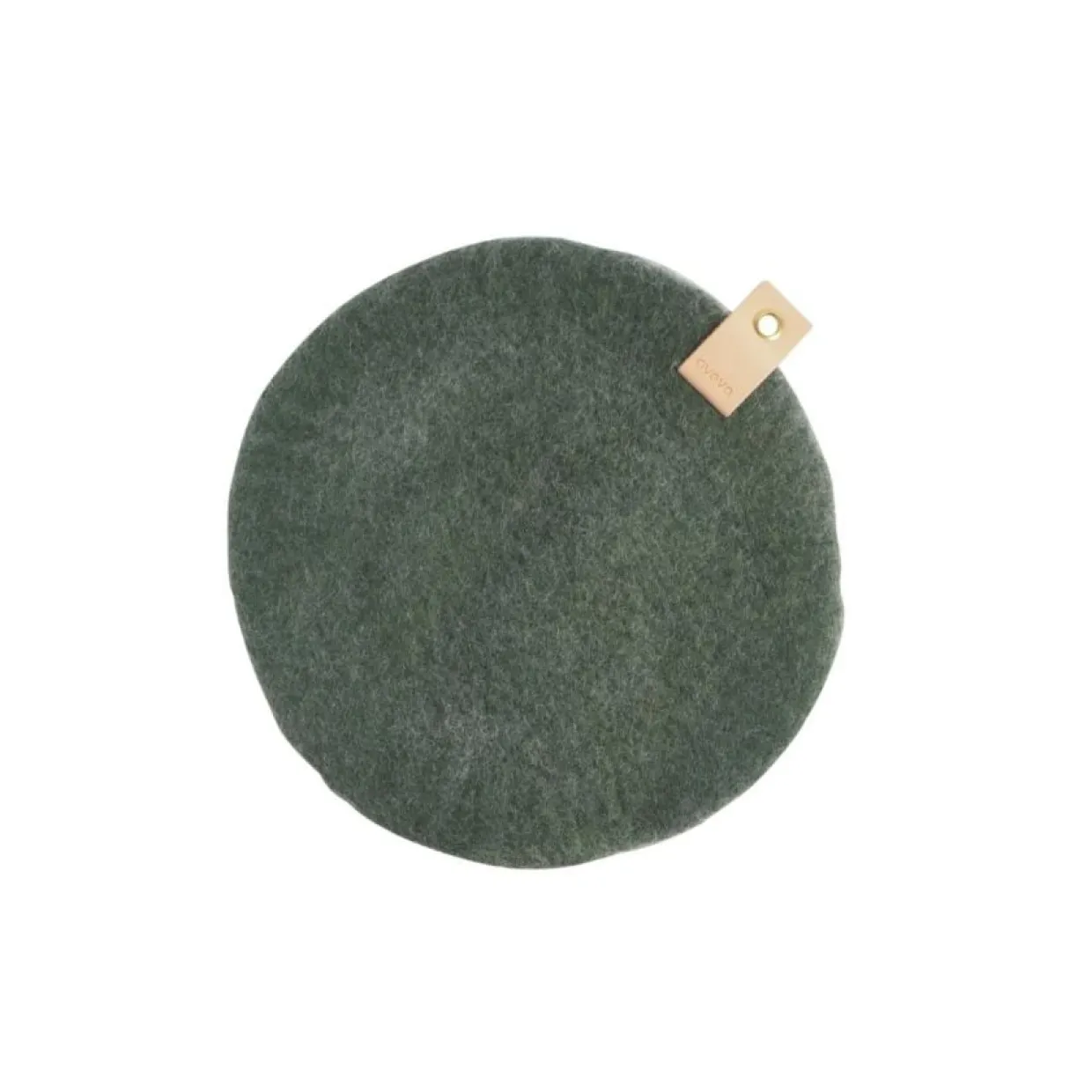 Avevas handgjorda sittdynor i ull, färgade med naturliga färger på ena sidan och gråmelerad ull på andra. Sittdynan har en läderdetalj med ögla, för till exempel upphängning. Lädret som är ekologiskt certifierat kommer från svenska gårdar och är raffinerat genom vegetabilisk garvning. Sittdynans mått är 33cm. Finns i flera färger.