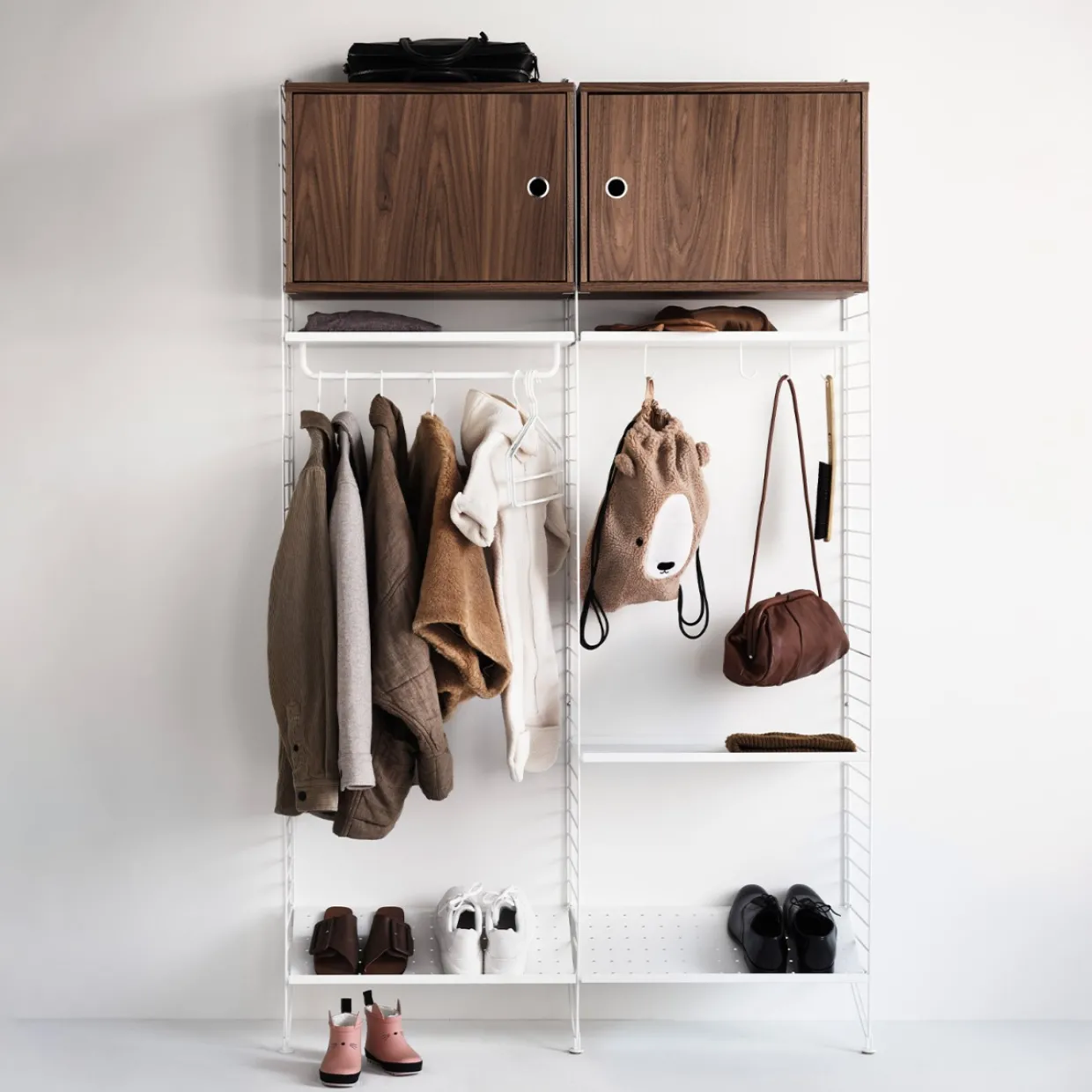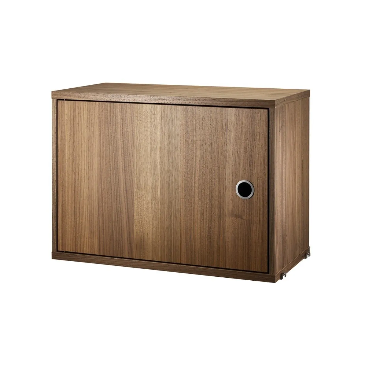 Skåp med dörr finns i en bredd, 58 cm, samt ett djup, 30 cm. Skåpet passar med tråd- och plexgavlar från String System förutsatt att gavlarna har 30 cm djup. Det är fint att bryta av din hylla med skåp som dessutom ger dig extra förvaring samt möjlighet att placera saker ovanpå. Skåpet består av ett innerhyllplan som kan justeras efter behov. Dörren är anpassningsbar och går att montera både på vänster och höger sida. Skåpet mäter invändigt: bredd 54 x djup 26 x höjd 38 cm. Levereras omonterat.