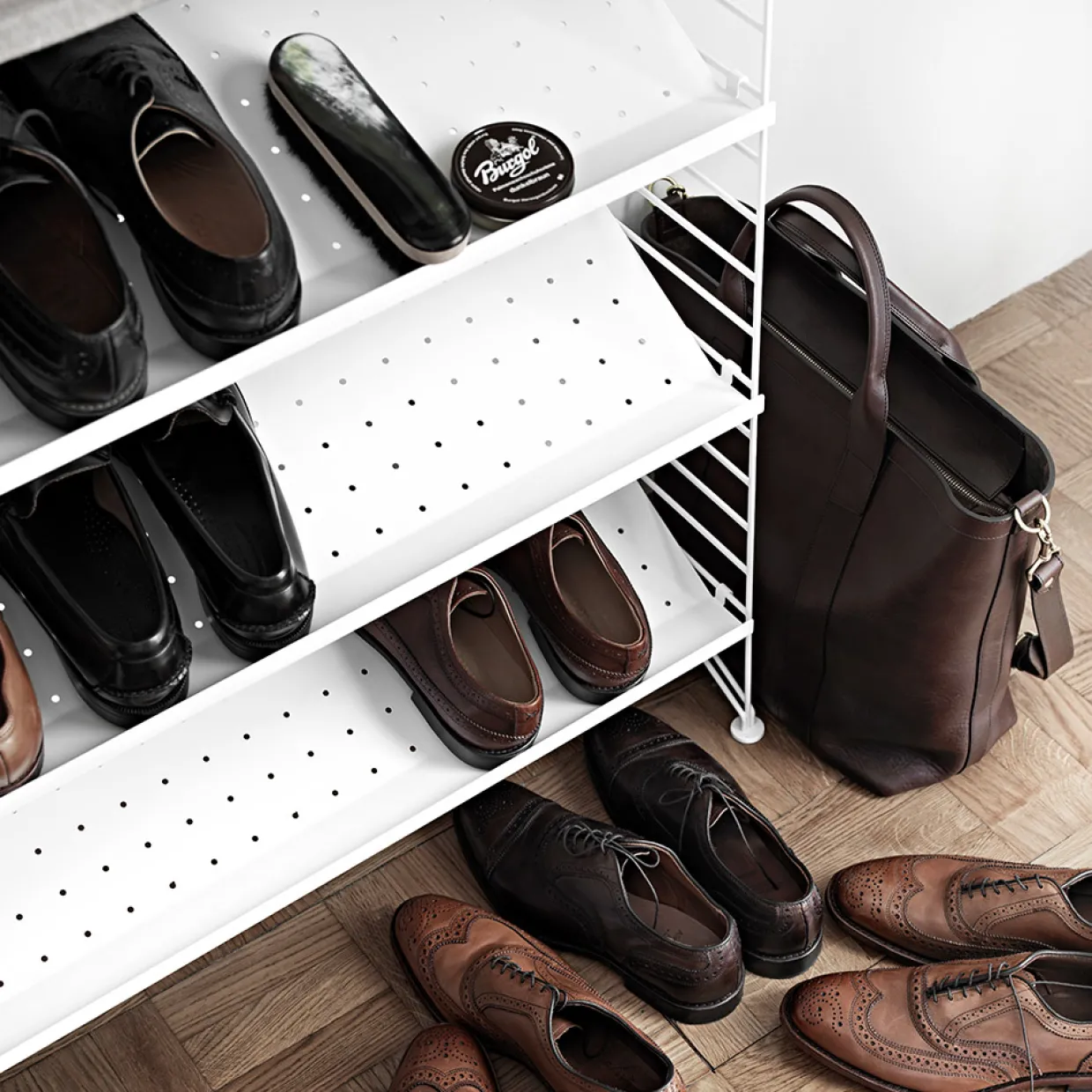 String skohylla i strukturlackad perforerad metall, perfekt till hallen. Formgiven av Anna von Schewen & Björn Dahlström för String Furniture.