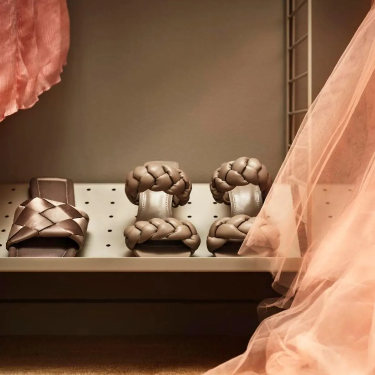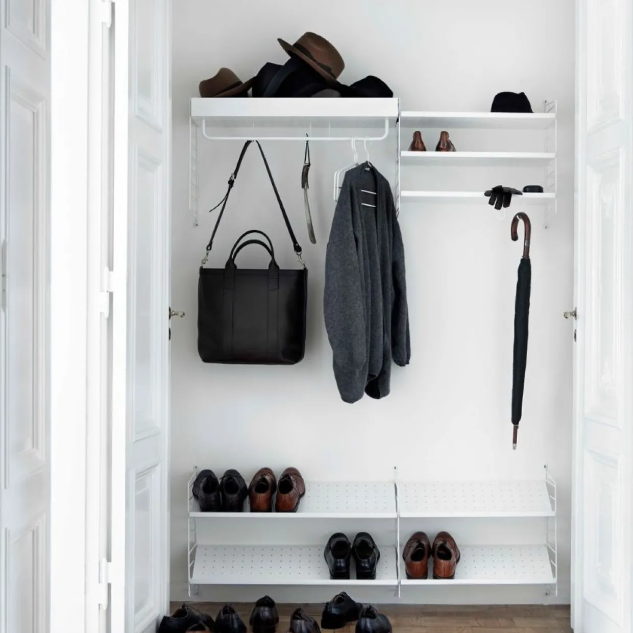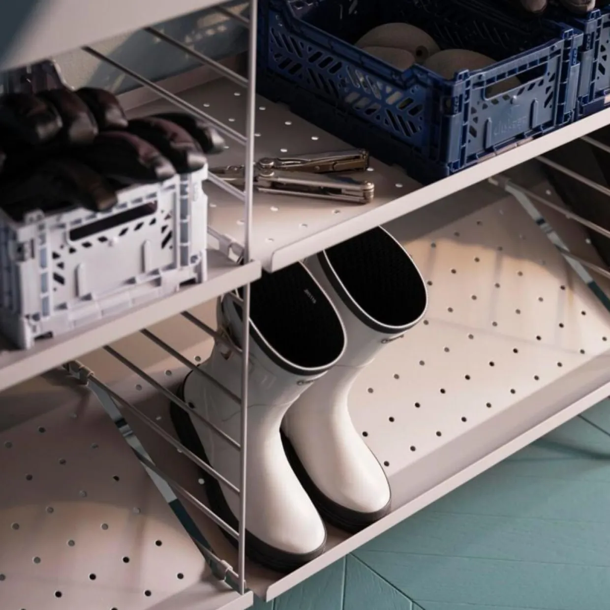 String skohylla i strukturlackad perforerad metall, perfekt till hallen. Formgiven av Anna von Schewen & Björn Dahlström för String Furniture.