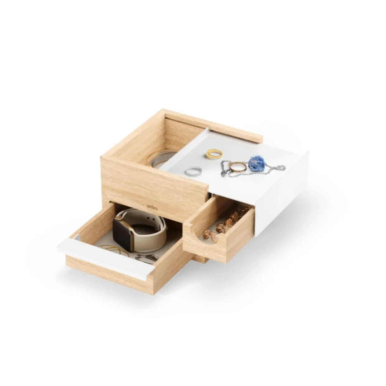 Det perfekta smyckeskrinet från UMBRA, för att hålla alla dina favoritsmycken på ett ställe, vilket gör dem lätta att komma åt. Flera dolda fack i olika storlekar gör att du kan förvara dina ringar, örhängen, armband, klockor, halsband och andra tillbehör i olika konfigurationer beroende på vad som passar dig bäst. Varje låda har en linnedyna för att förhindra att dina smycken flyttas runt eller skadas. Den enkla, moderna designen hos smyckeslådan är ett attraktivt tillskott till din byrå, nattduksbord, skrivbord eller var du än väljer att ställa den. Dessutom håller de skyddande gummifötterna den säkert på plats och säkerställer att vilken yta du än placerar den på inte kommer att repas av trä- och metalldesignen. Alternativt kan smyckesskrinet också användas som en minneslåda, för att förvara små värdesaker och andra prydnadssaker från dina äventyr, eller som en lådorganisator i ditt skrivbord eller nattduksbord. Mäter 15 x 17 x 11 cm. Kommer från förnybara träkällor och tillverkas med en miljövänligare finish. Den producerar 85 % mindre vatten och fast avfall än traditionella galvaniseringsfinisher. Trä är ett unikt naturmaterial med variationer i ton, textur och ådring kan förekomma.