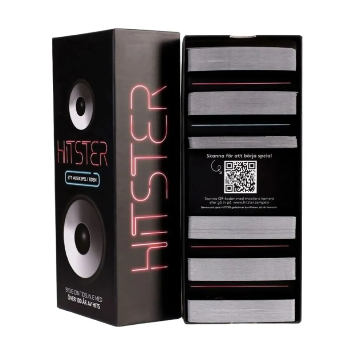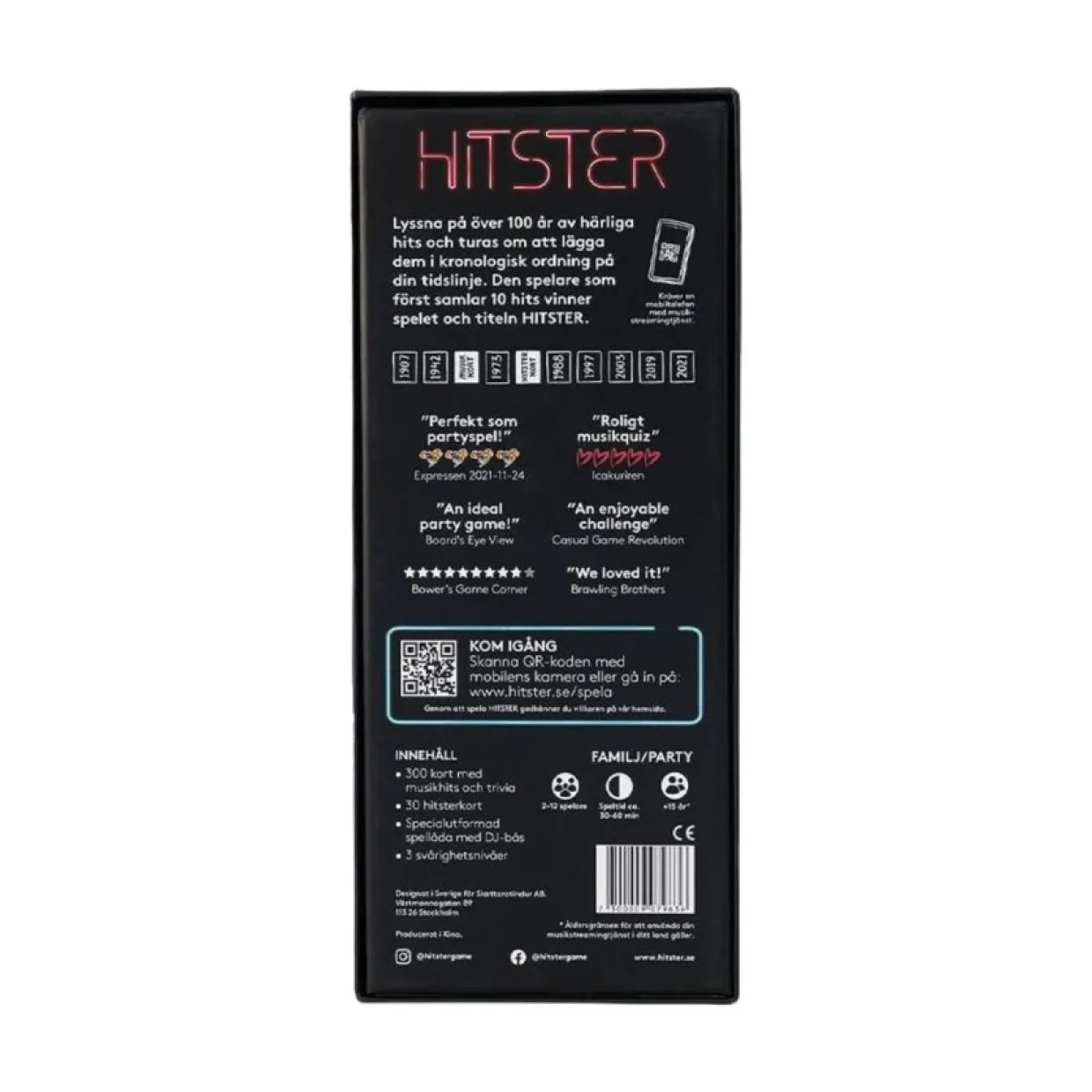 Spel Hitster – Lyssna på över 100 år av musikhits och turas om att gissa när låtarna släpptes. Du behöver inte veta det exakta året, bara om de släpptes före eller efter andra låtar. Dina chanser att vinna ökar om du också kan nämna artisterna och låttitlarna. Den första spelaren som lyckas ordna 10 hits i kronologisk ordning vinner spelet och får titeln HITSTER. Observera att för att spela HITSTER med full spelupplevelse måste du använda en smartphone med musikstreamingappen Spotify. För 2-12 spelare, från 15 år och uppåt.