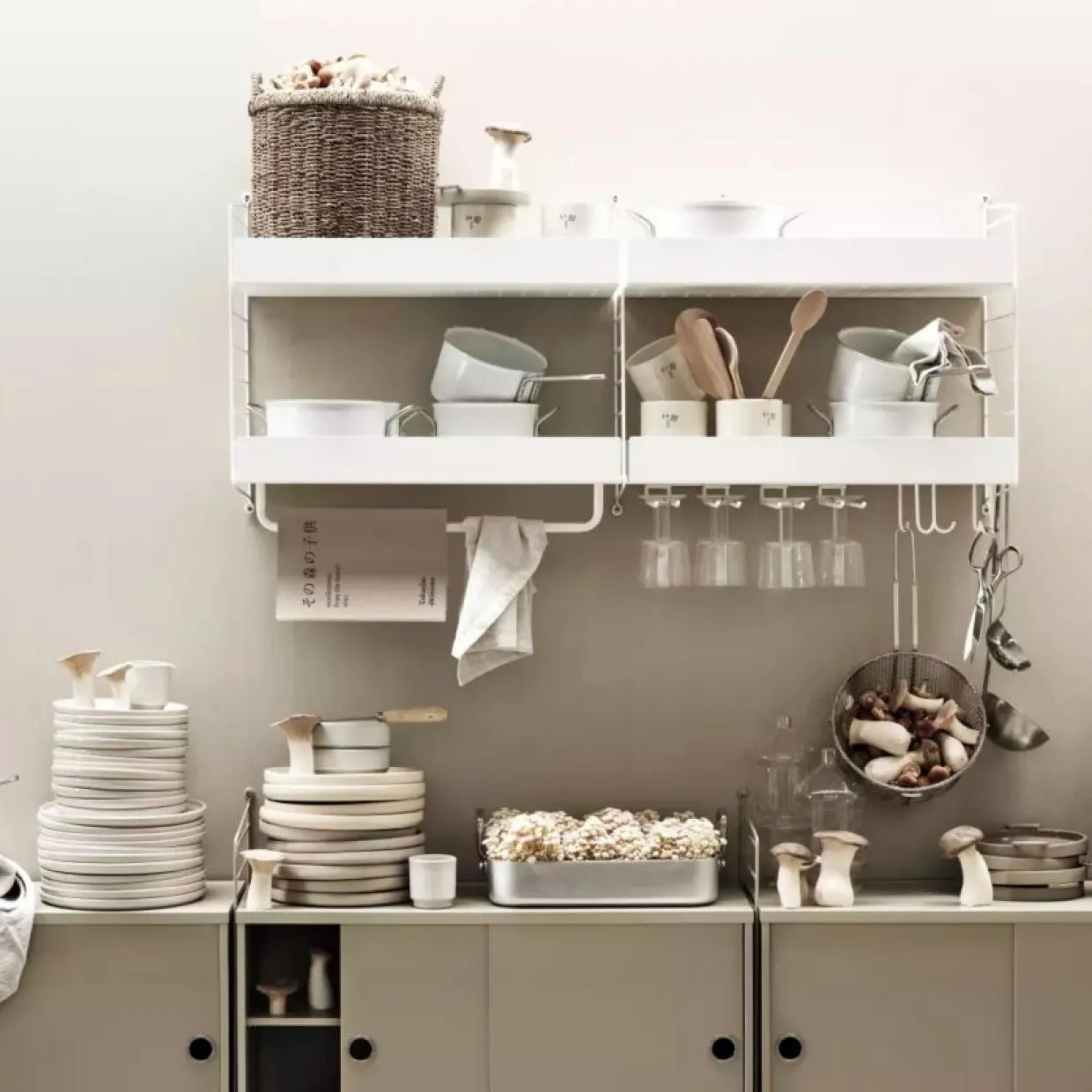 2017 års Stringnyheter bjöd på bland annat perforerade metallhyllplan, där du kan välja mellan hög eller låg kant. Perforeringen öppnade upp möjligheten att koppla på både stänger och krokar. Nu är det dessutom möjligt att montera glashängarna med spjut för att snyggt visa upp sina finaste vinglas, ölglas eller champagneglas.