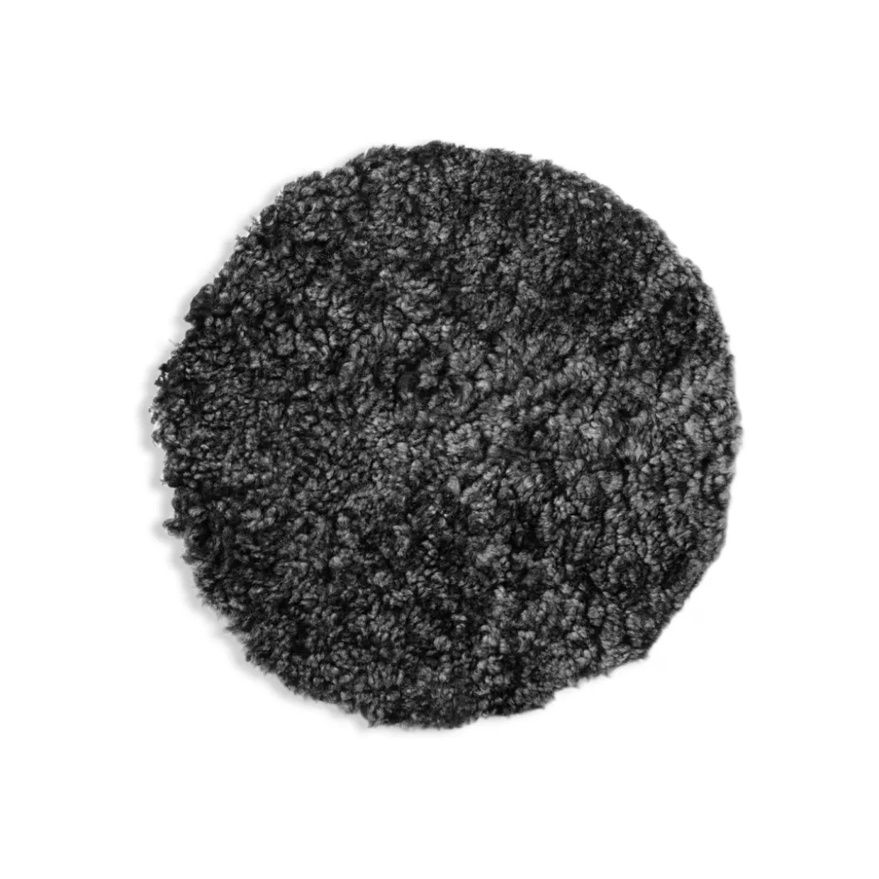Fårö mörkgrå är en rund sittdyna i mjukt och fluffigt fårskinn, med en baksida som håller dynan på plats.