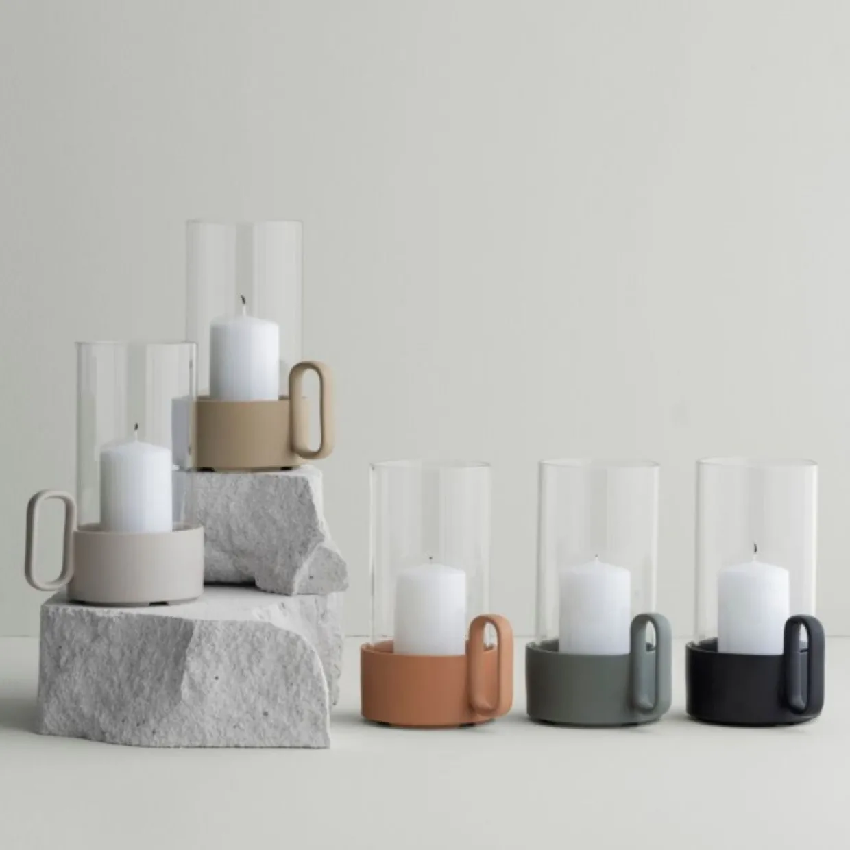 YURAGI, designad av den japanska designern Kazushige Miyake, är en slående enkel men mycket funktionell modern version av den klassiska orkanlampan. Den består av en bärbar keramisk bas och en glascylinder som skyddar det brinnande ljuset. Tack vare handtaget är lampan lätt att transportera.