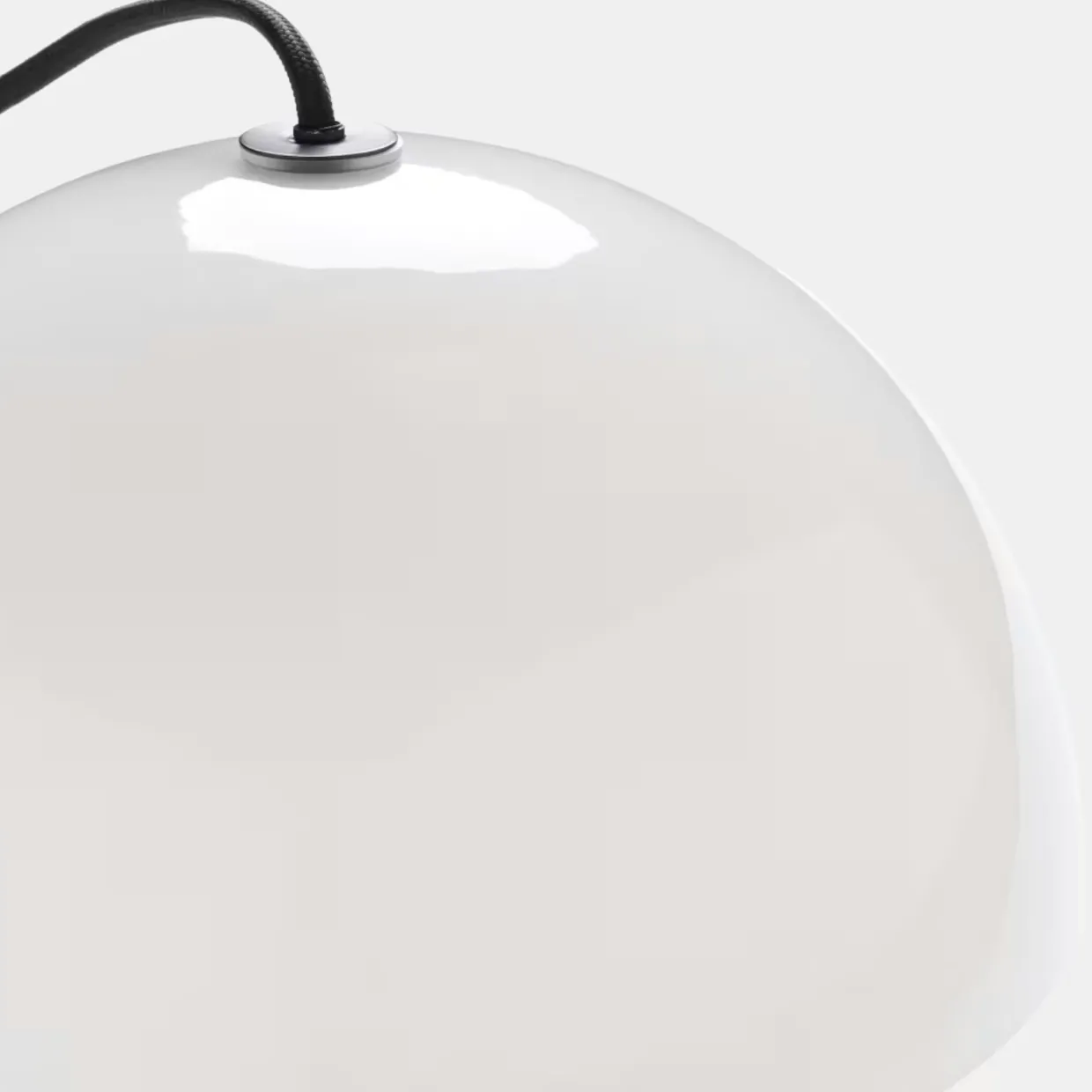 Lampan har en skärm av glas och en svart textilsladd med färgmatchad takkopp.
