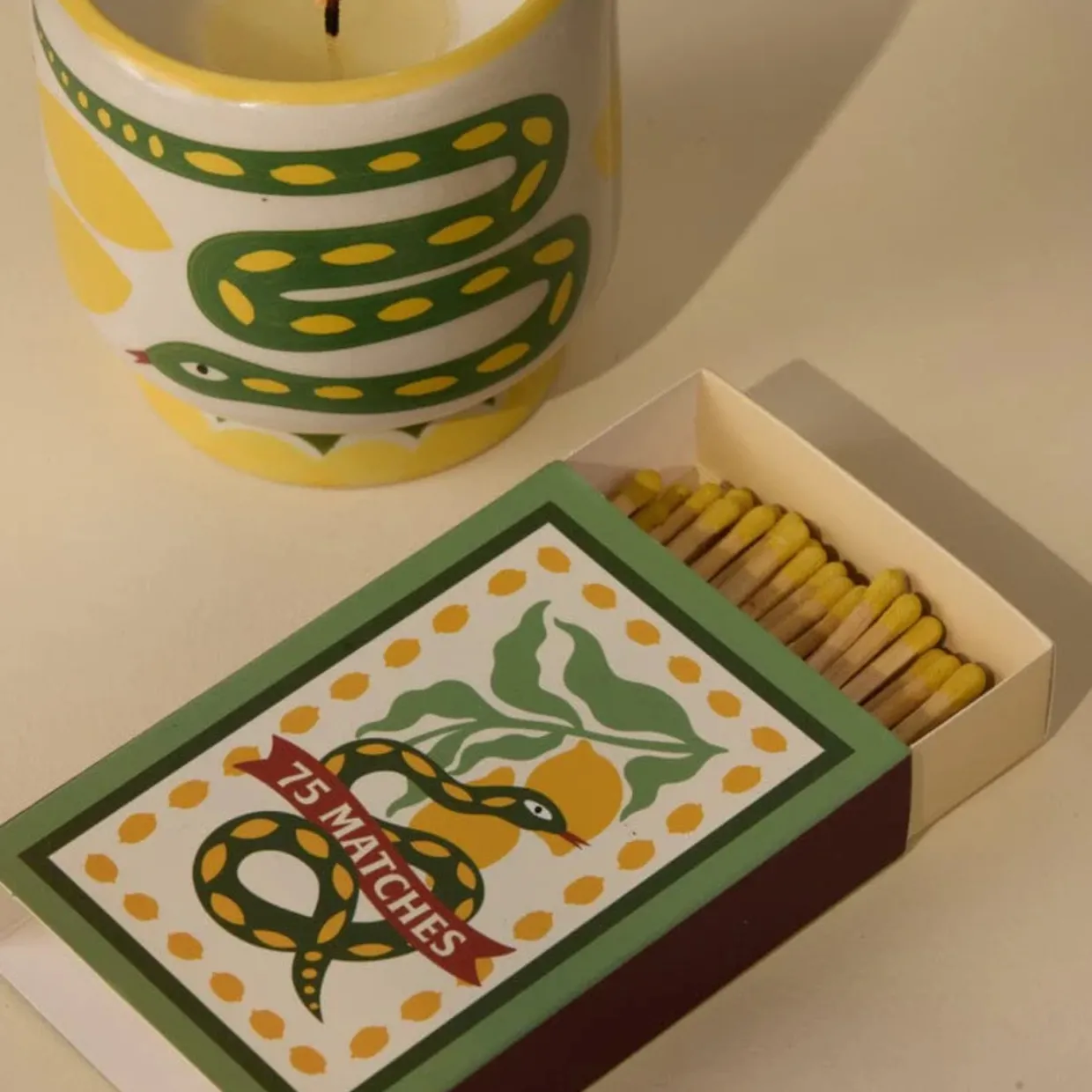 A dopo! Översätts till Vi ses senare! Den här vänliga attityden har inspirerat den här finurliga kollektionen som anspelar på sommarens resor över Medelhavet och andra platser. Dessa tändsticksaskar är illustrerade i samma stil och har fyllts med 75 tändstickor med färgat huvud som passar till ditt favoritljus A Dopo!