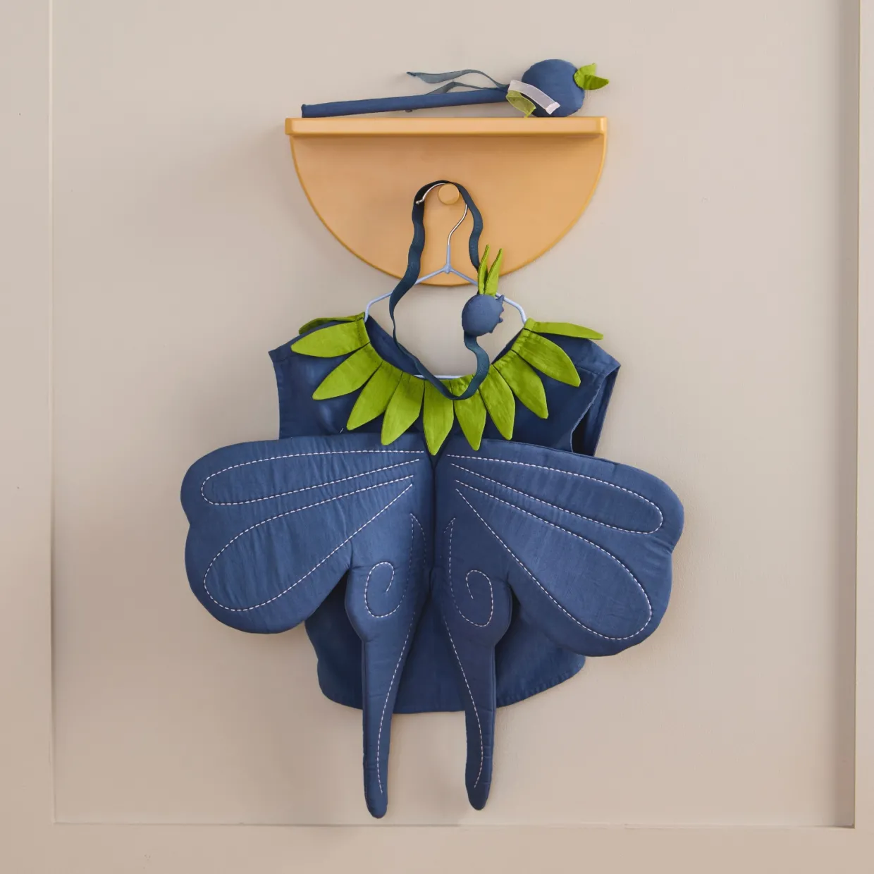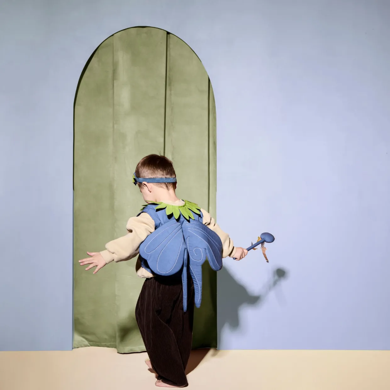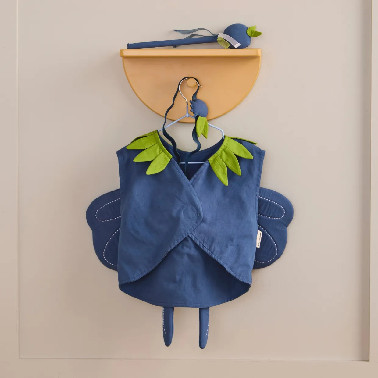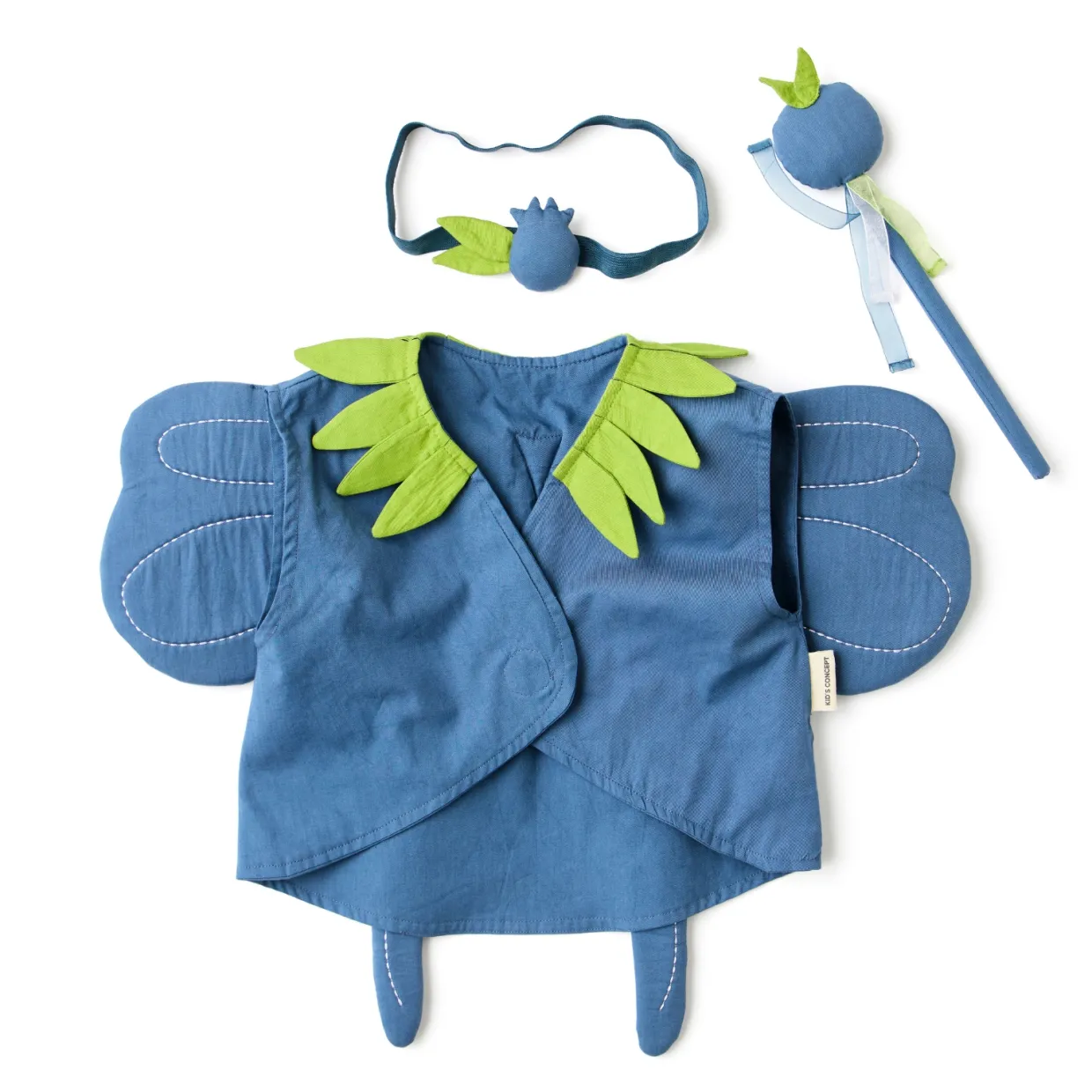 En blå väst, blå vingar och ett blåbär på huvudet – det här är kostymen för barn som vill förvandla leken till ett sagoskogsäventyr. Västen har rundad framkant, krage med gröna blad och små vadderade vingar på ryggen. I setet ingår också ett hårband med ett blåbär som dekoration och en matchande trollstav. Kanske för att strö lite blåbärsmagi över leken? Samla på låtsasbär i en påhittad skog eller hitta på egna små sagor där blåbär spelar huvudrollen. Kostymen knäpps med kardborre och är lätt för barn att ta på och av själva. Västen är sydd i certifierad bomull och framtagen för både bekväm lek och stora fantasier