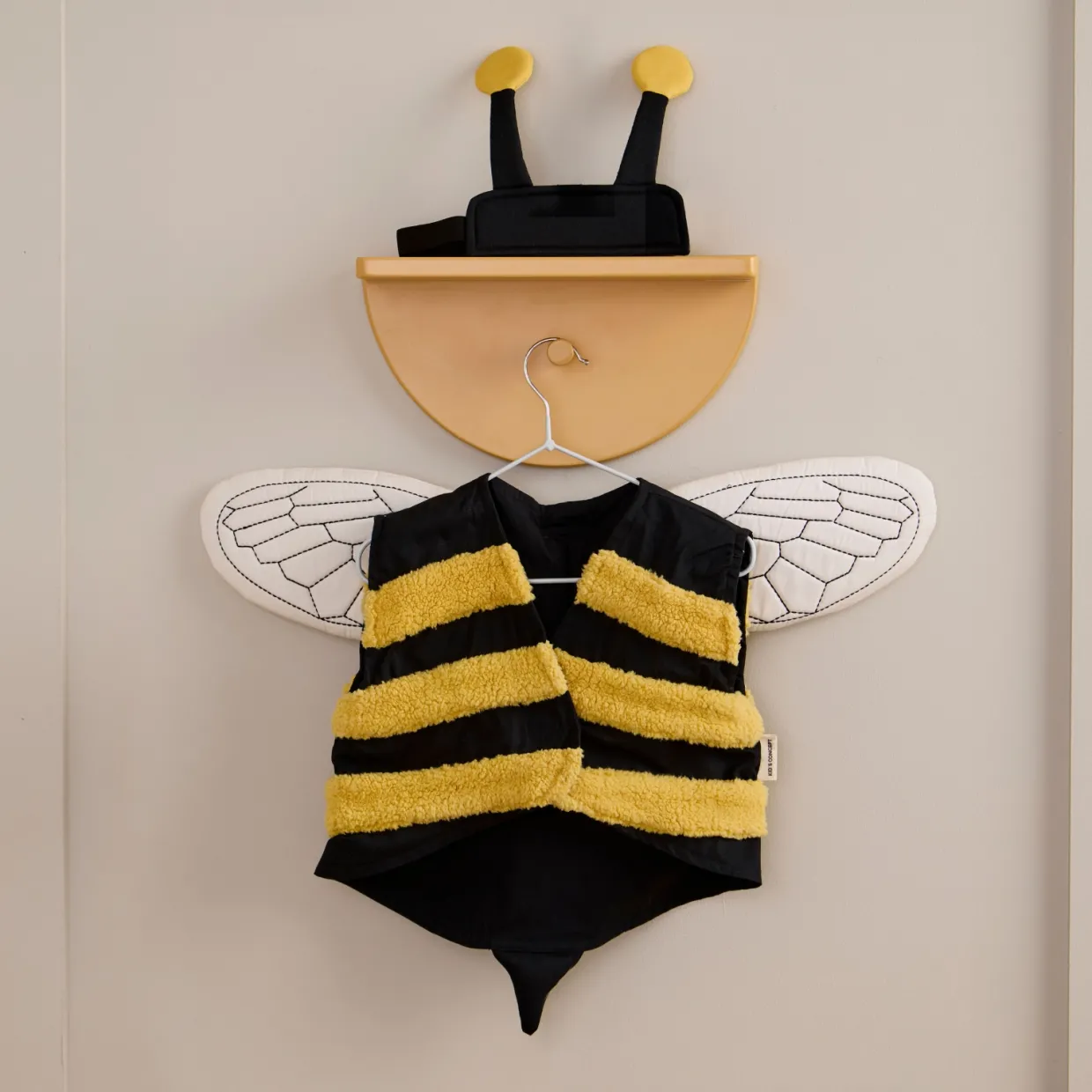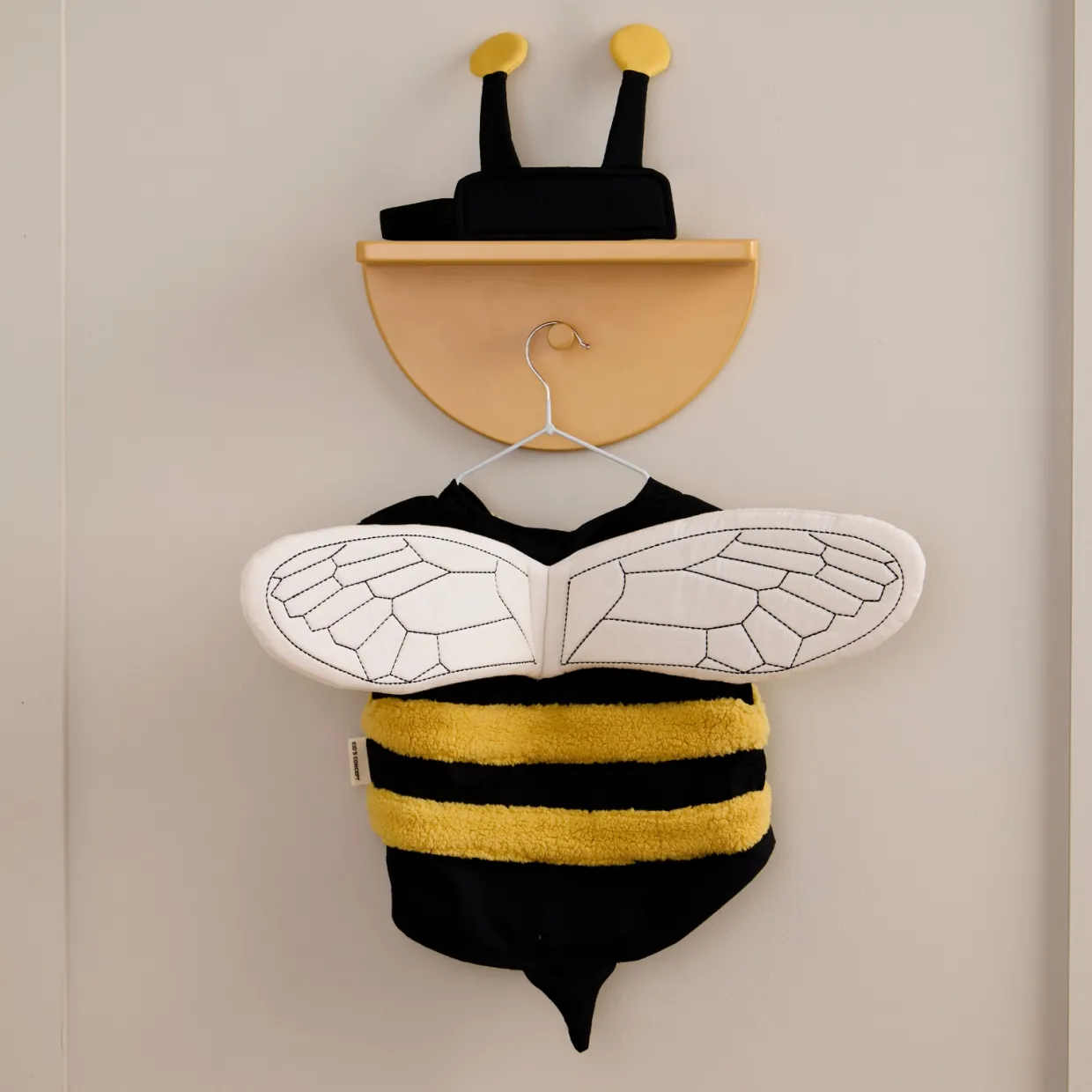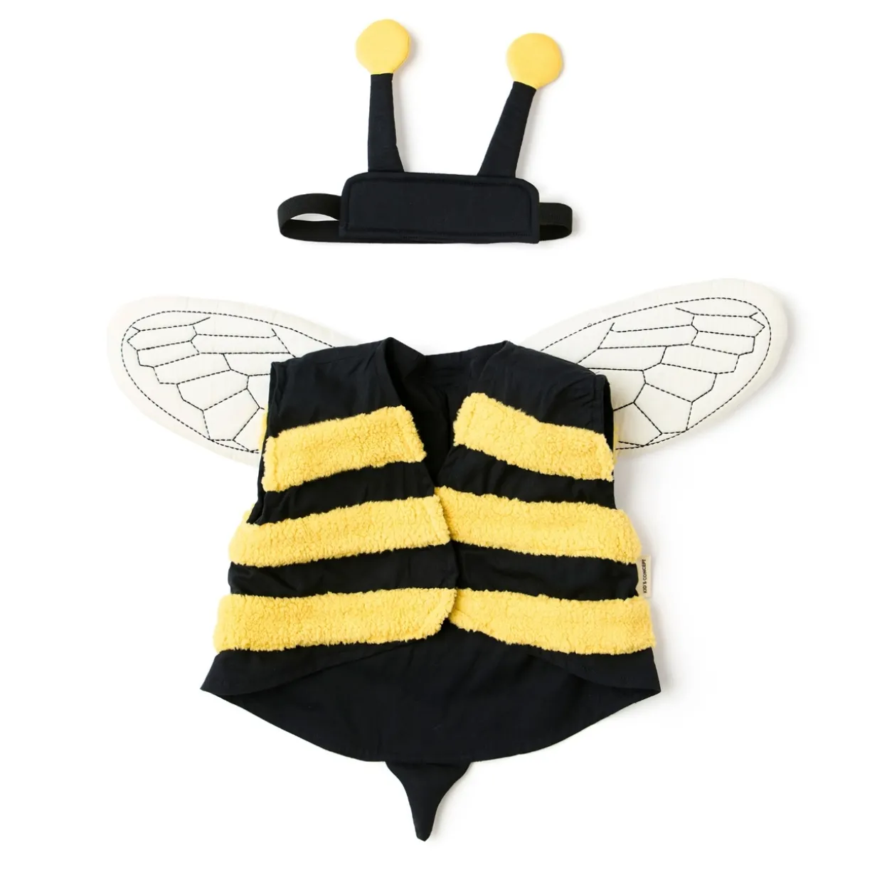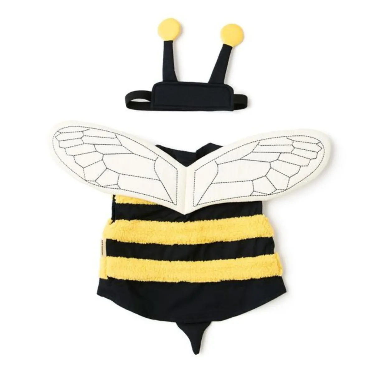 Den här humlekostymen ger barn låtsas vara en liten humla och låtsas att dom flyger omkring i naturen. Västen har gula, mjuka ränder som påminner om humlans päls och har broderade, vadderade vingar på ryggen som ger en fin detalj. Pannbandet med små antenner fulländar kostymen och gör den både enkel och charmig. Både västen och pannbandet stängs med kardborre, vilket gör det lätt för barnen att ta på och av under leken. Barnen kan låtsas flyga mellan blommorna, pollinera eller upptäcka världen som en flitig humla. Den här kostymen erbjuder både komfort och smart design.