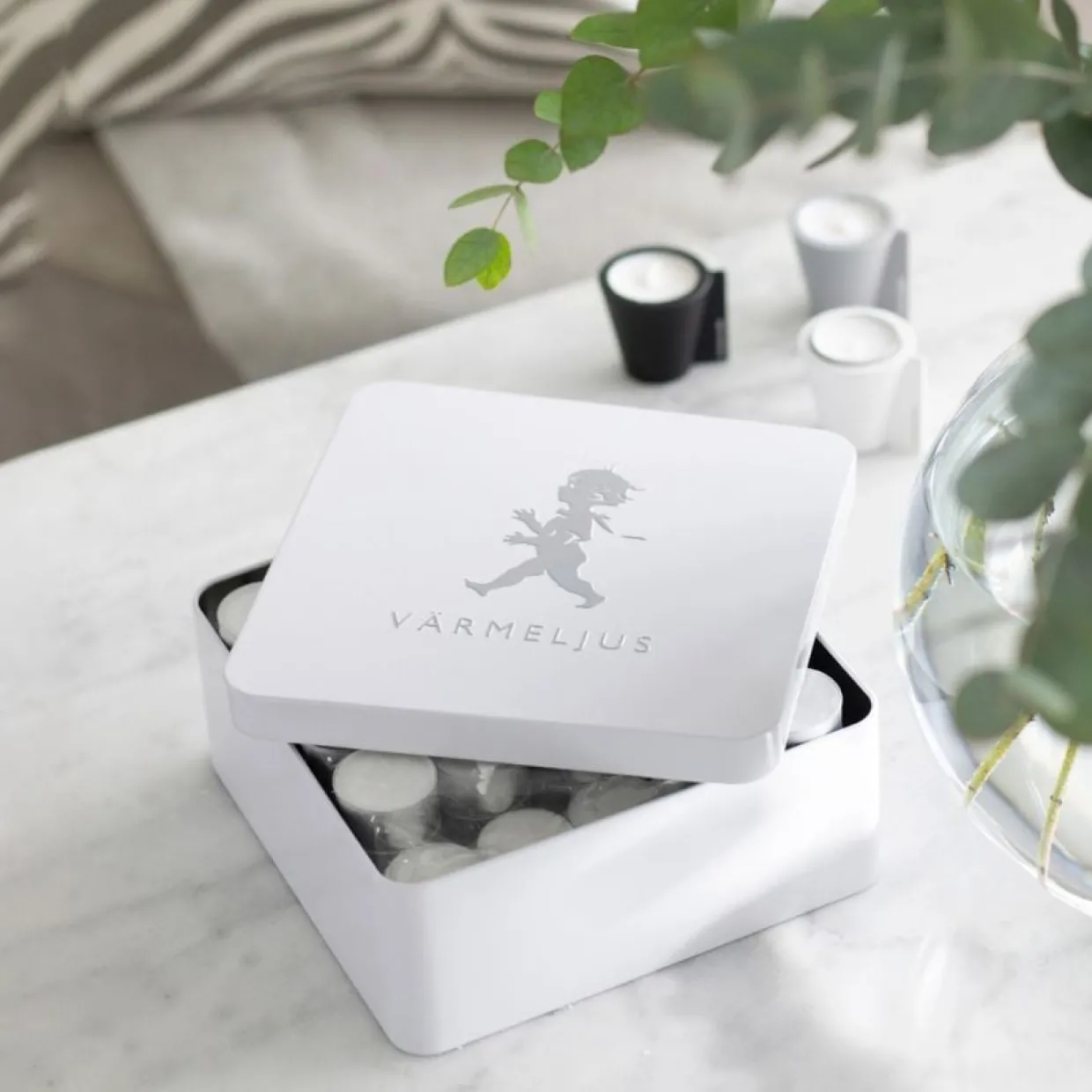 Dekorativ och smart förvaringslåda för värmeljus från Solstickan. Lådan har plats för 100 stycken värmeljus.