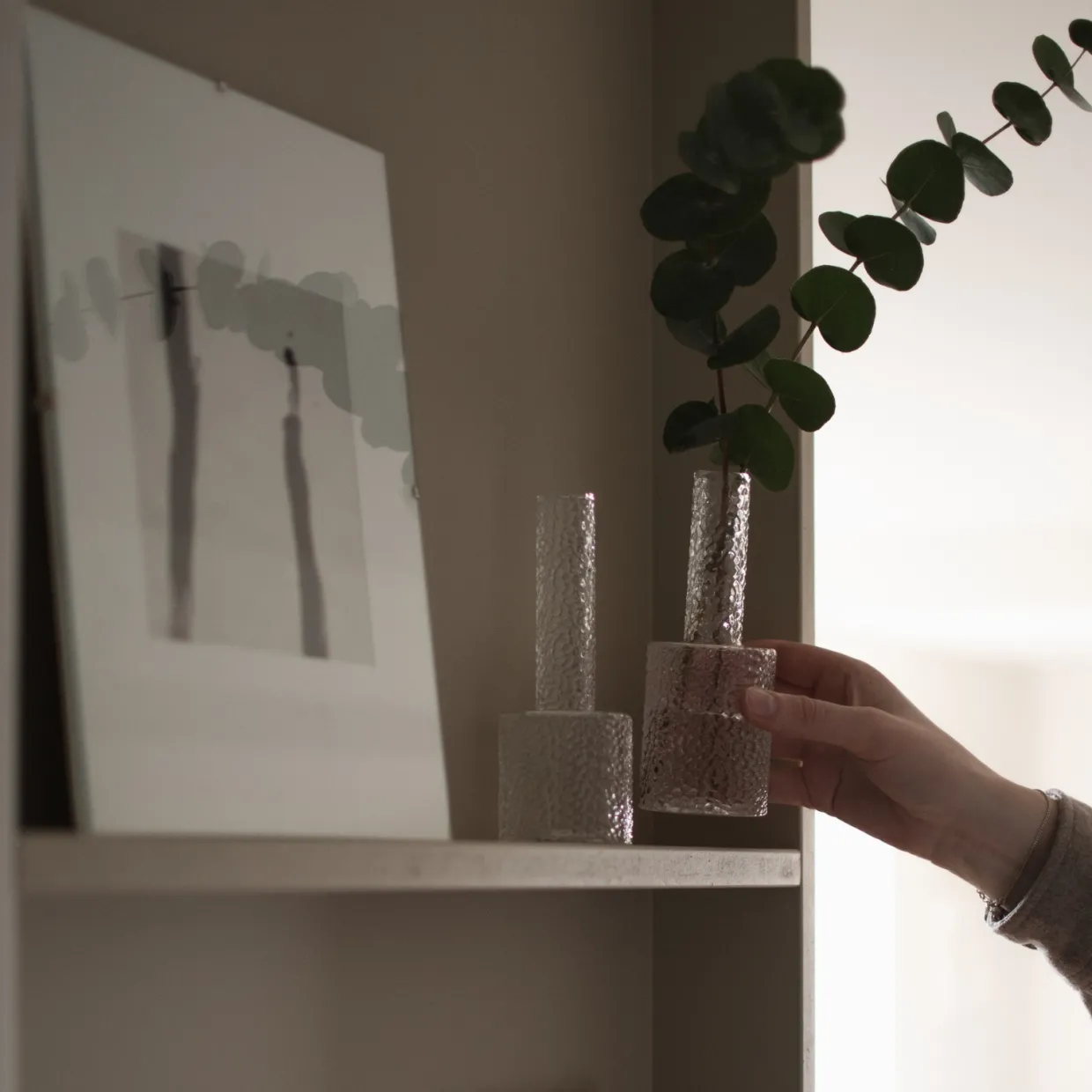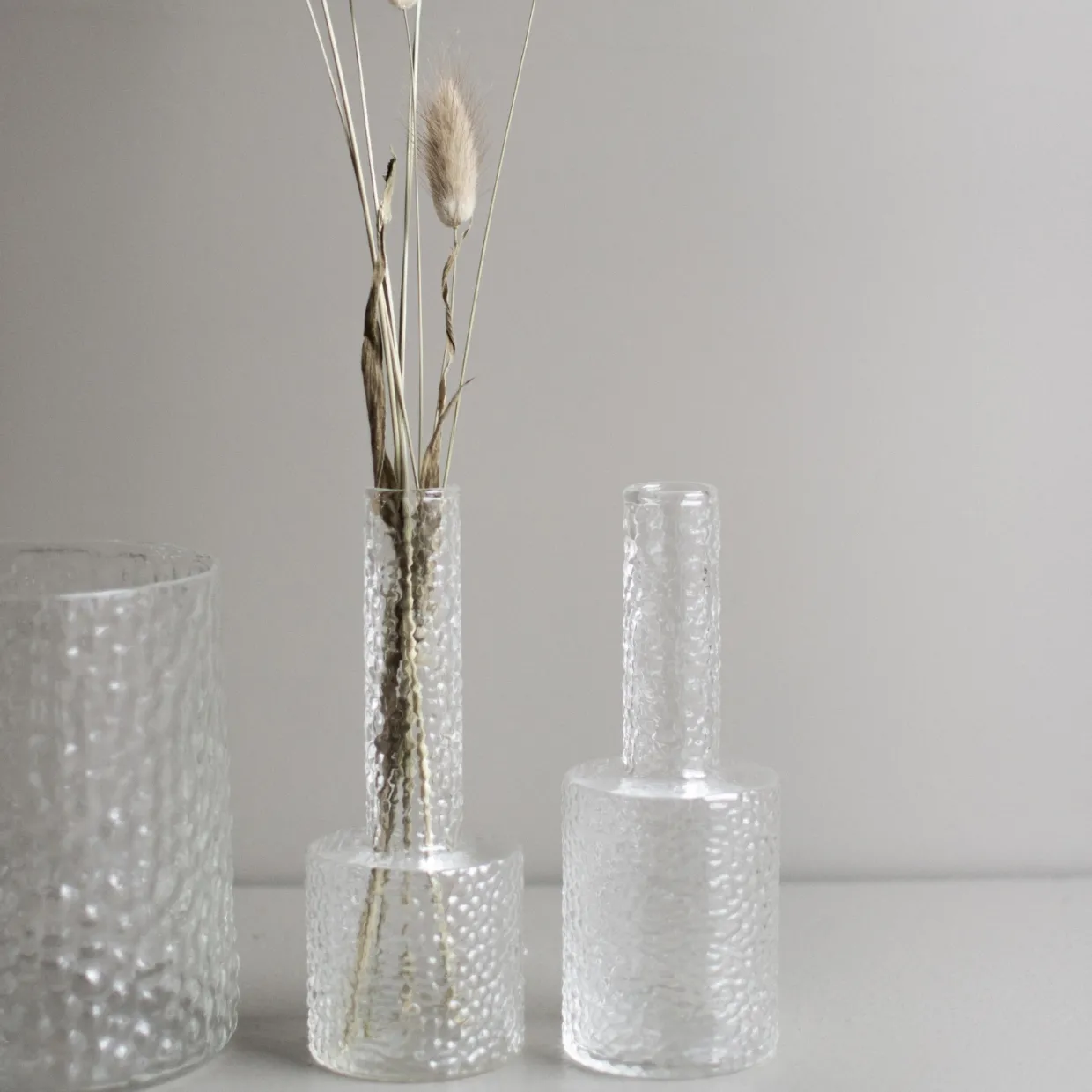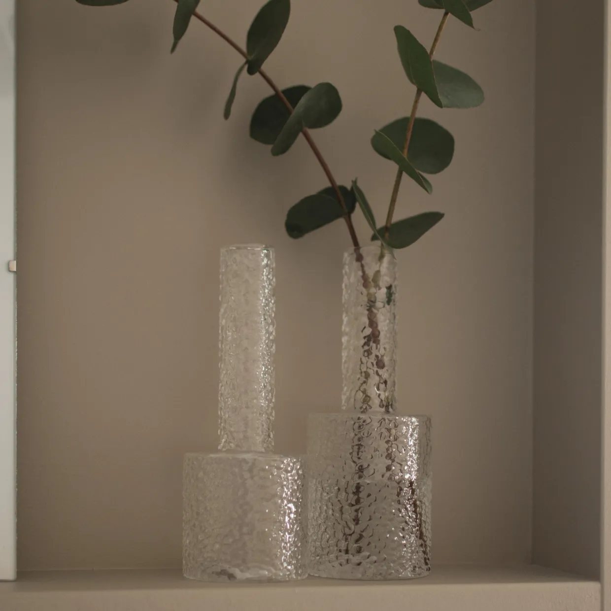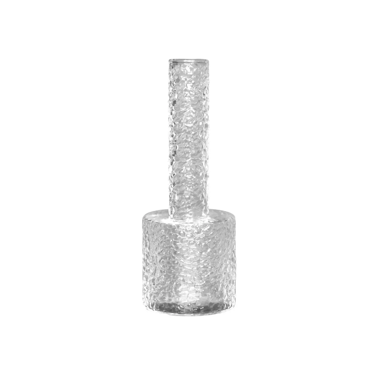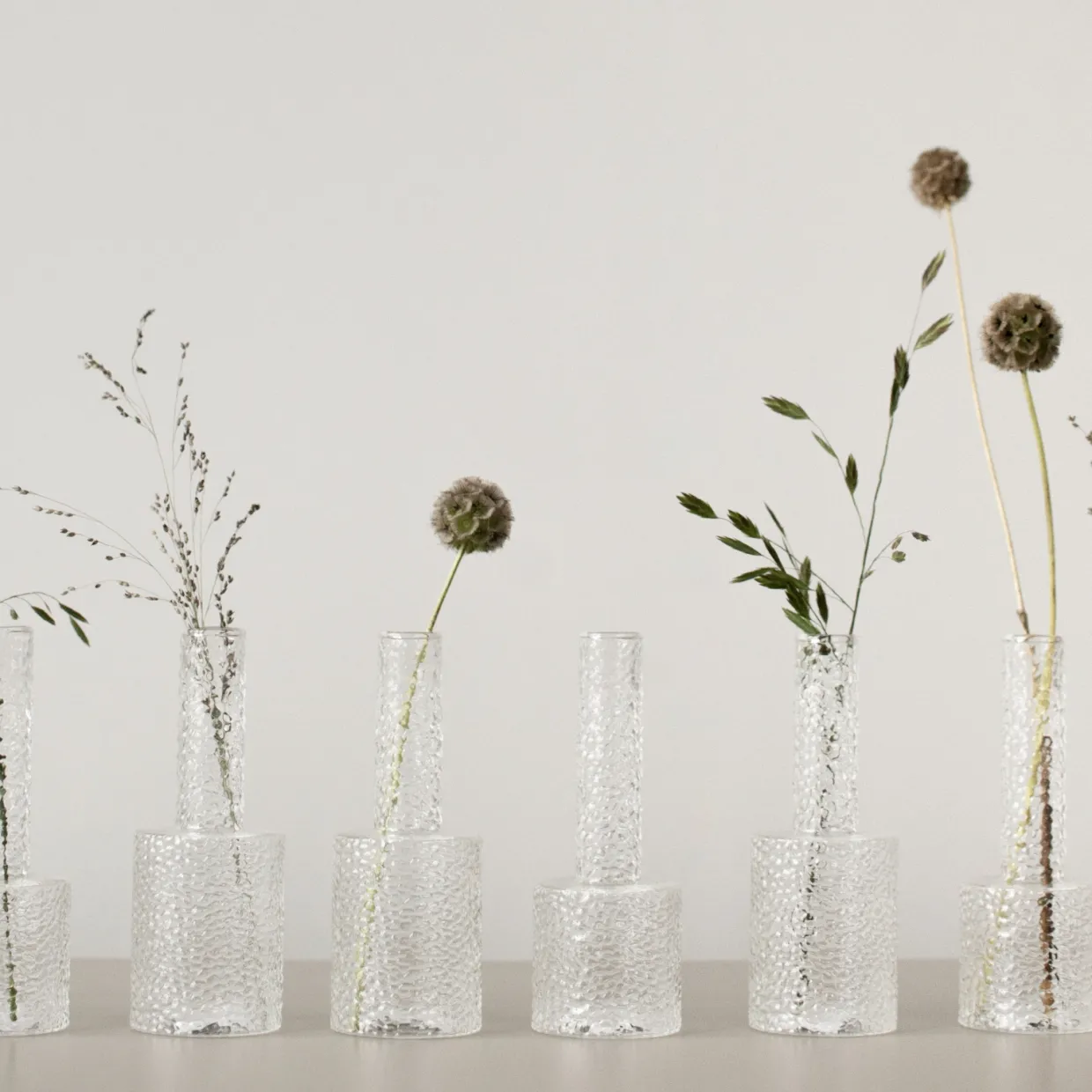 Vasen Airy från Svenska DBKD är en liten vas i glas med smal hals, perfekt till enstaka snittblommor eller egenplockade kvistar. Ytan på vasen är bubblig och oregelbunden och ger vasen extra karaktär. Vasen mäter 6x16cm.