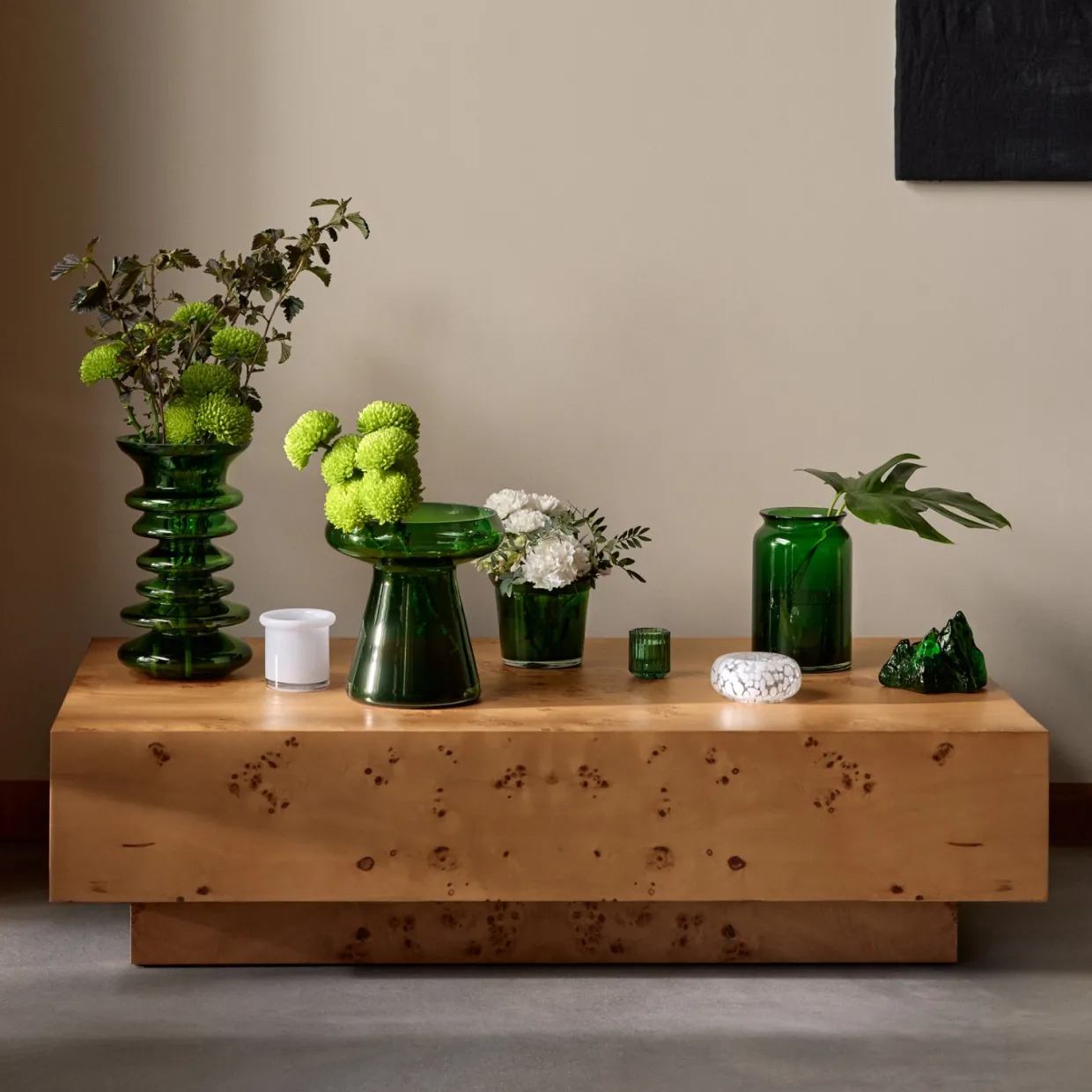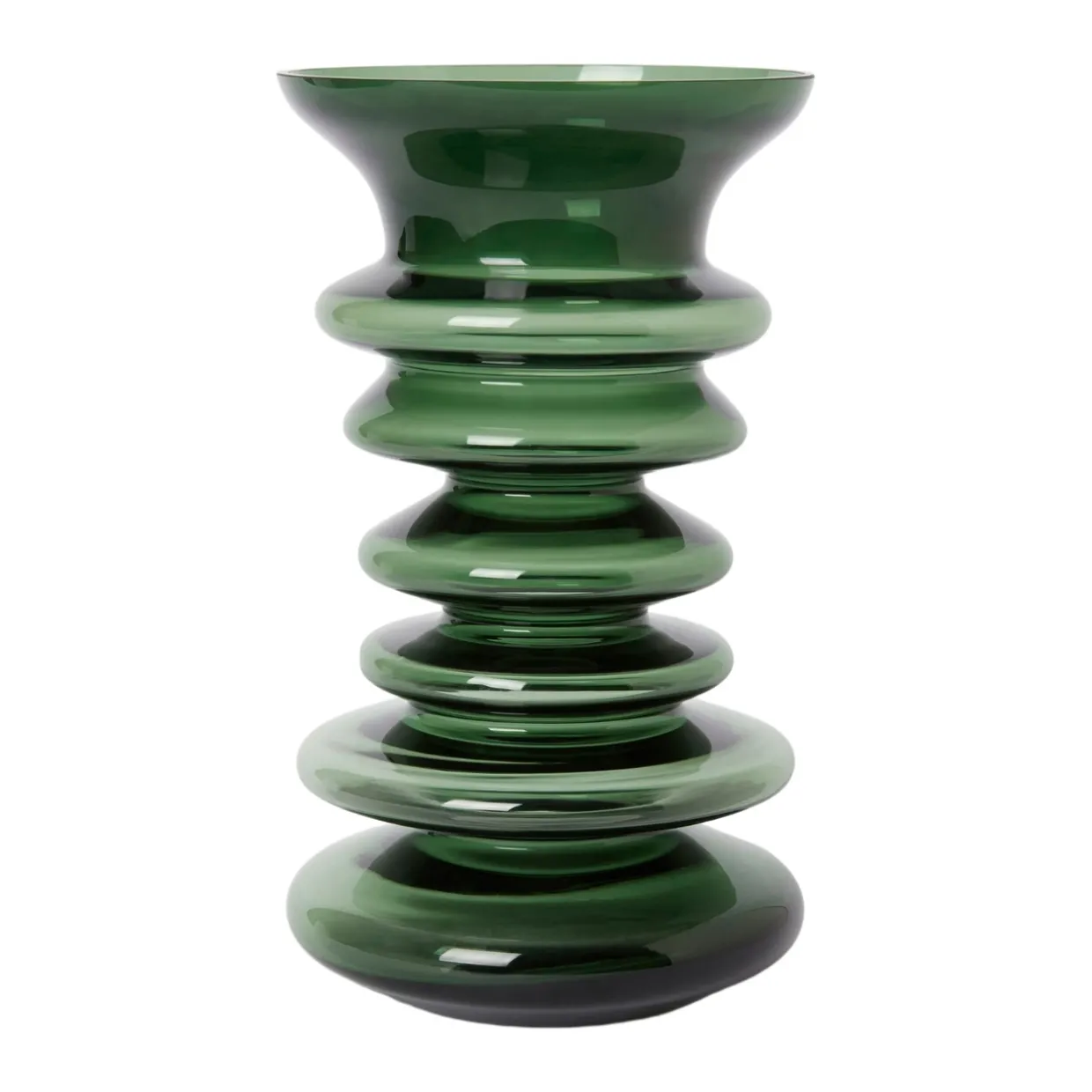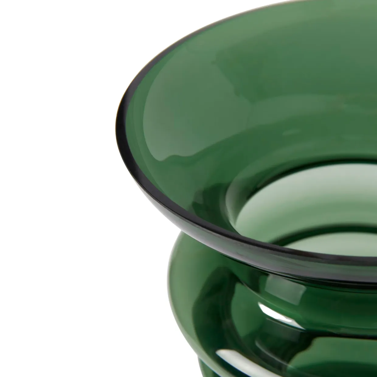 Glasvas i grönfärgat glas med lekfull design och vid öppning. ALBA vas blir en fin inredningsdetalj till färska snittblommor eller ris.