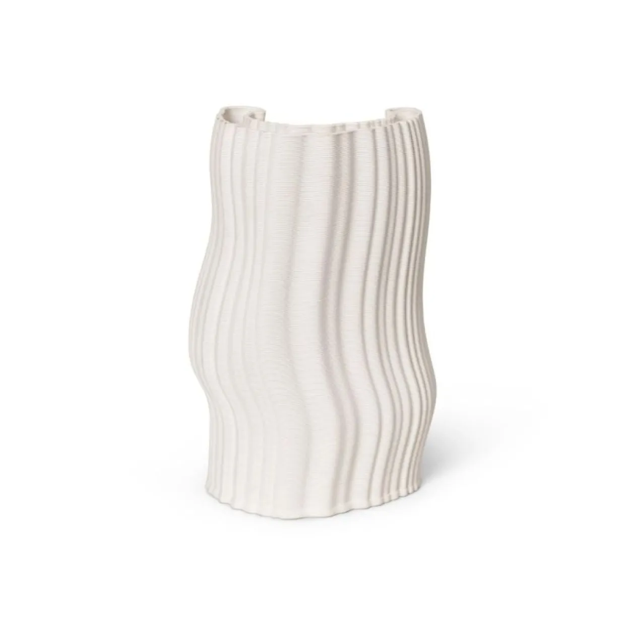 Vasen Moire är en vacker vas från Ferm Living som du antingen kan placera dina favoritblommor eller grenar i, eller låta göra ett uttalande helt på egen hand med sitt fina utseende. Namnet kommer från det franska ordet för ”vattnad” och moirémönstret representerar en grafisk effekt som uppstår när det organiska och geometriska krockar. Moire-vasen har skapats genom en process av 3D-utskrift av lera, vilket resulterar i tunna lager som gradvis har format ett subtilt mönster tvärs över vasens kropp och avslöjar dess digitala ursprung.