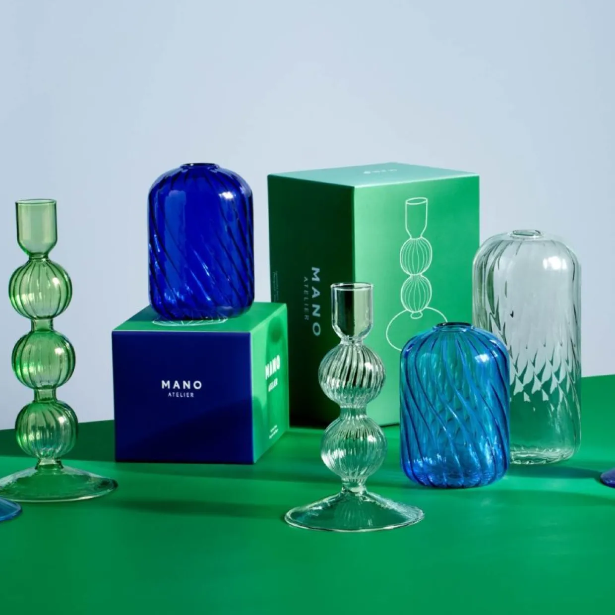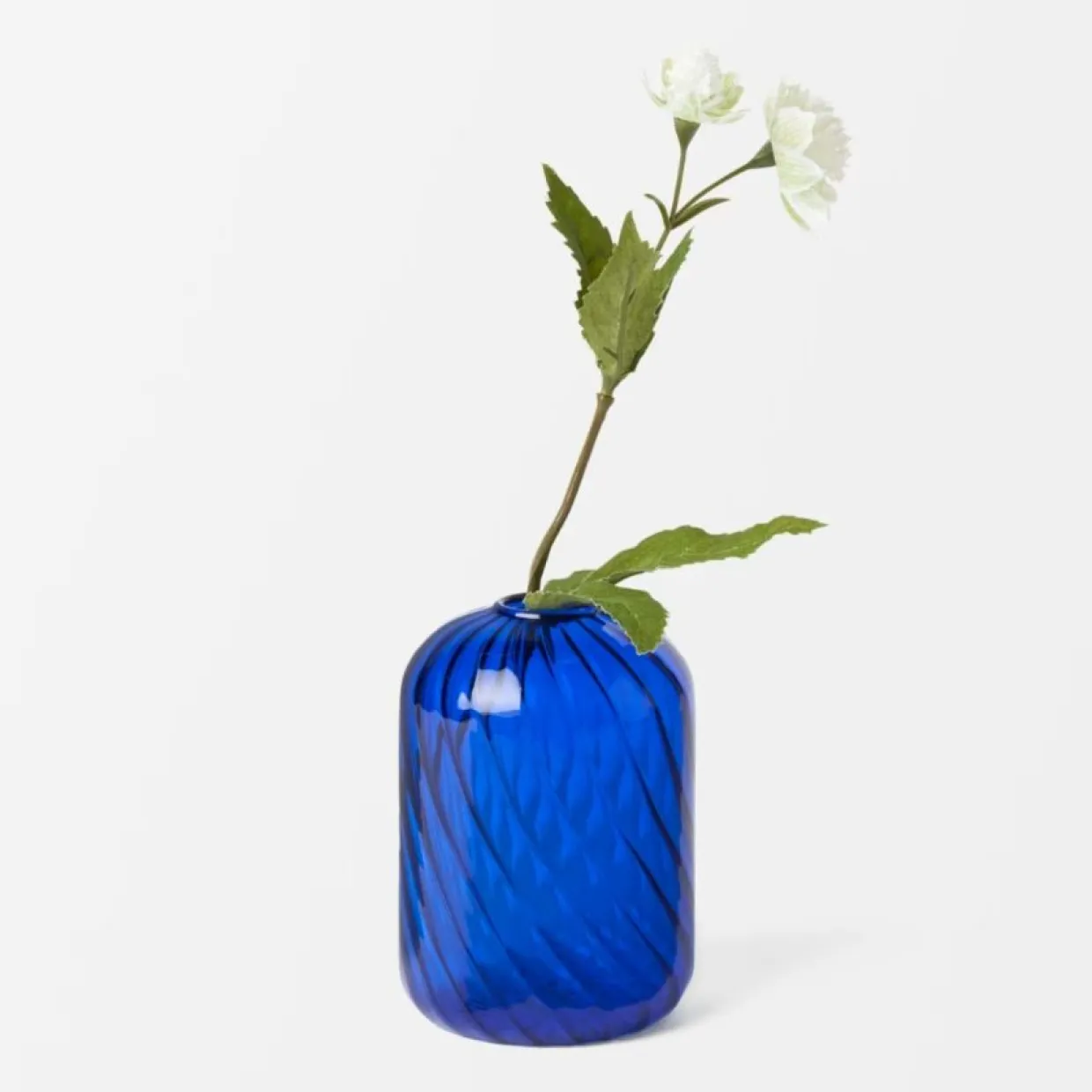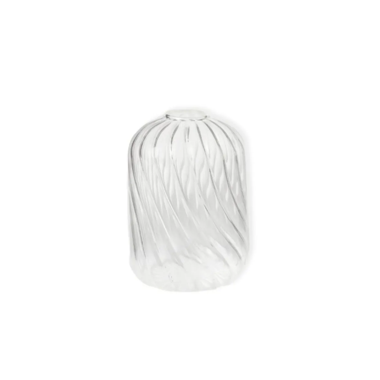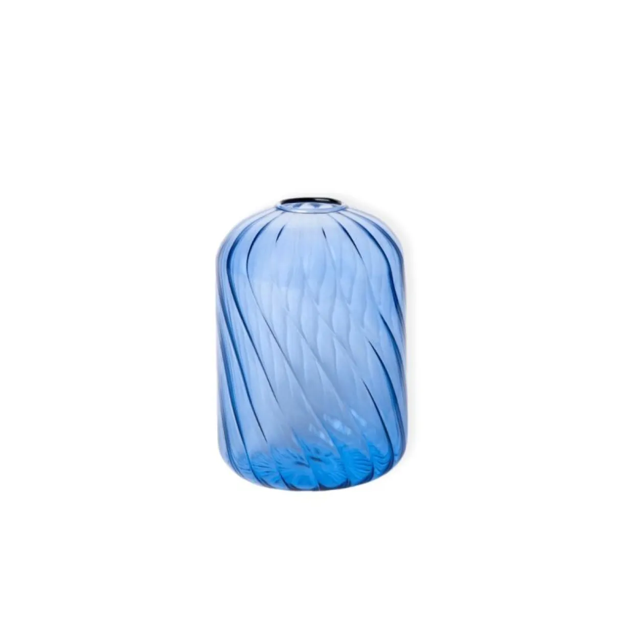 Vacker vas i färgat, transparent borosilikatglas från Mano Atelier. Vasen är cylinderformad med rundade kanter och har en spiralformad yta som bryter ljuset på ett lekfullt sätt. Öppningen är något mindre och passar utmärkt för mindre buketter eller enskilda blommor med lång stjälk. Finns i två nyanser av blå samt helt transparent och två olika storlekar.