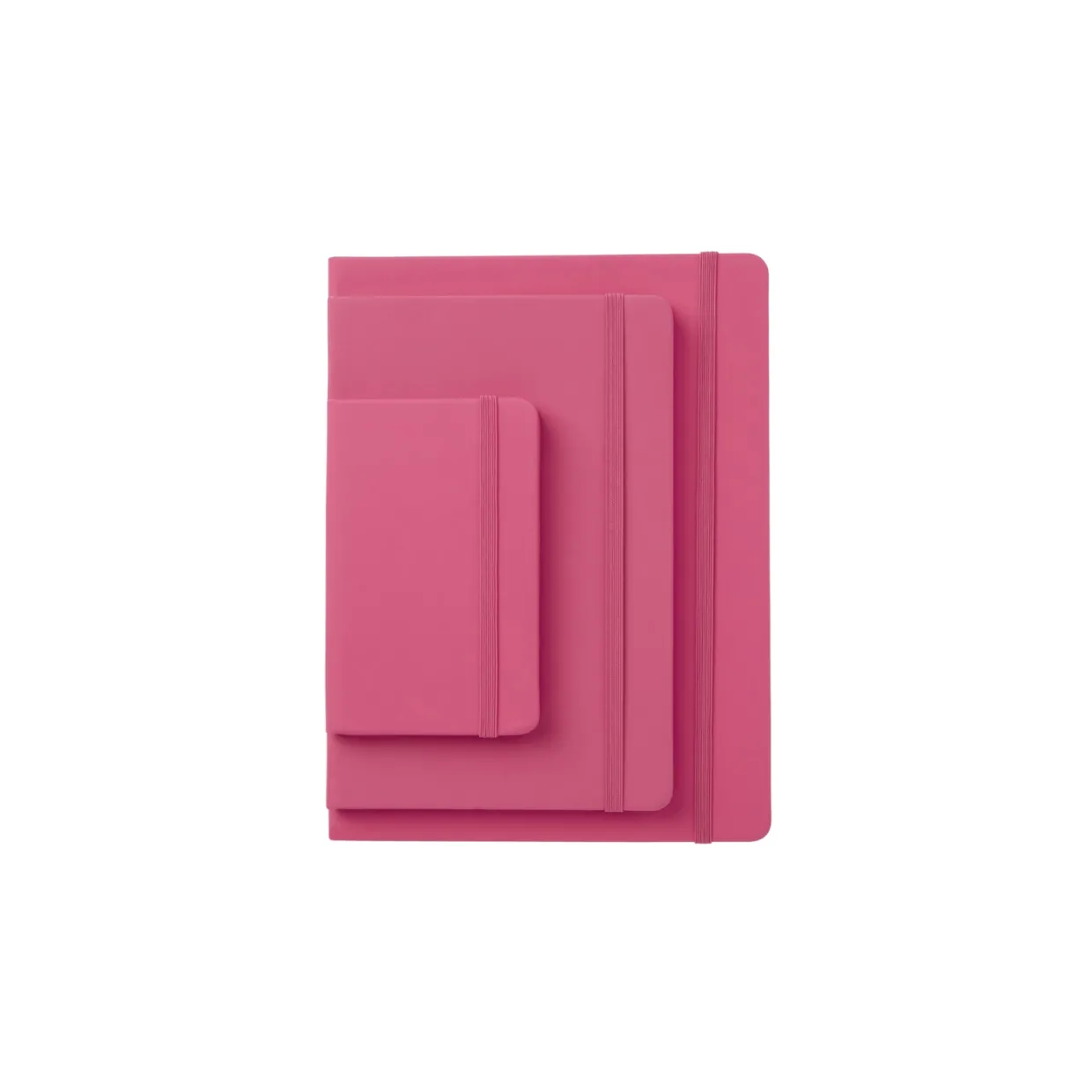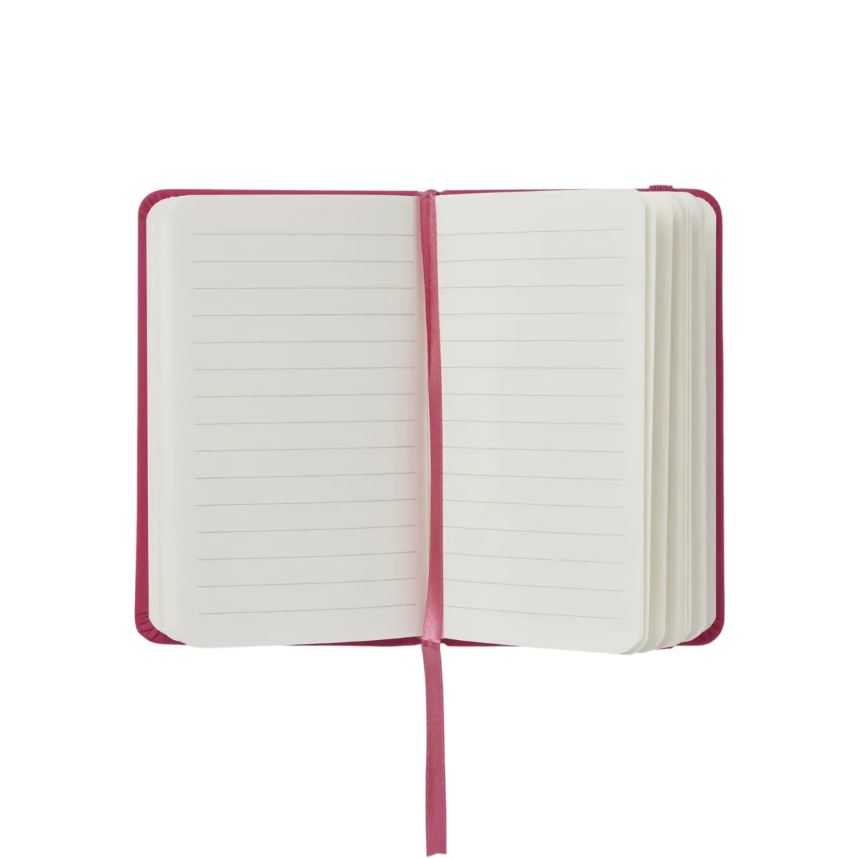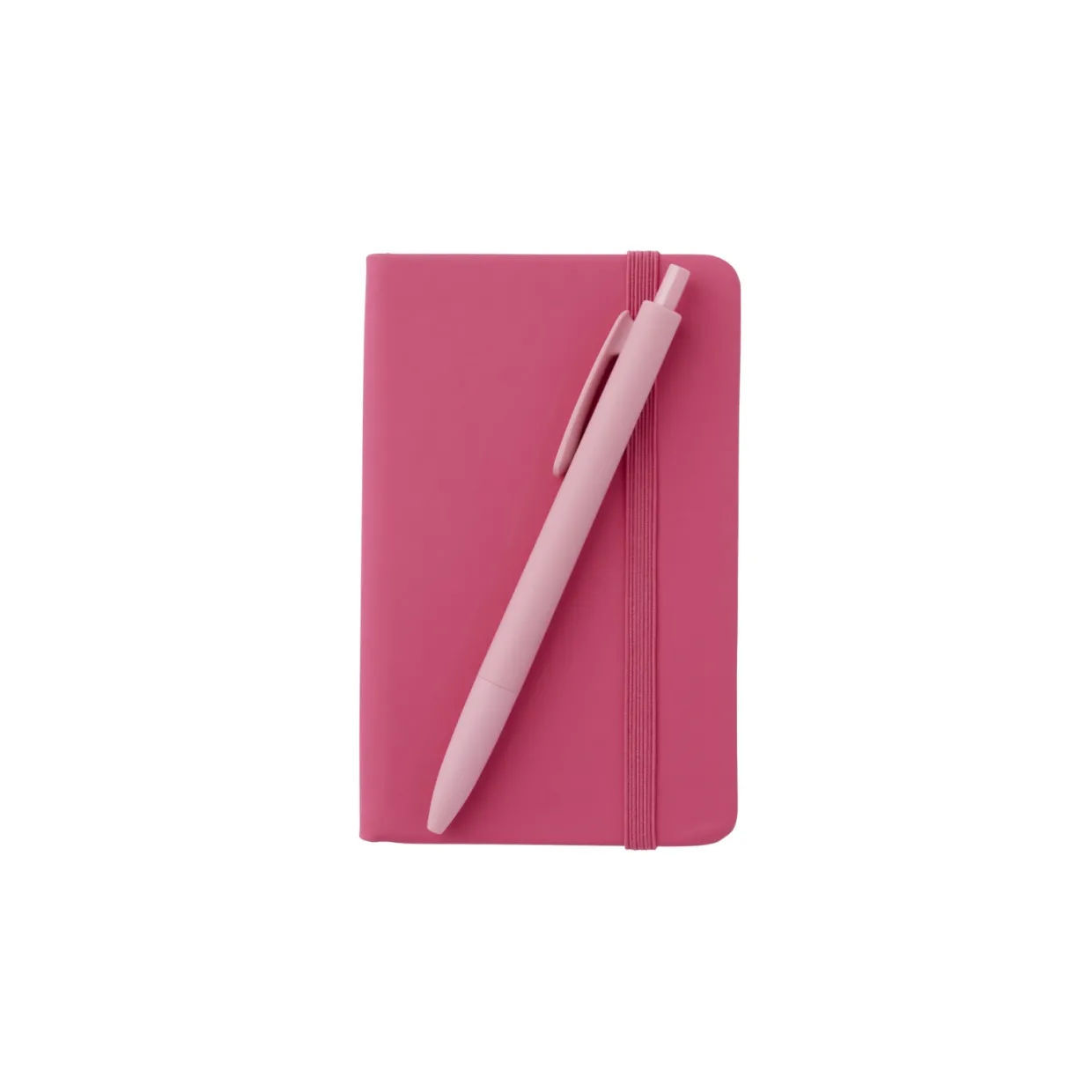 Liten skrivbok klädd i konstläder med färgmatchad elastisk snodd, perfekt att ta med i handväskan eller på resan.