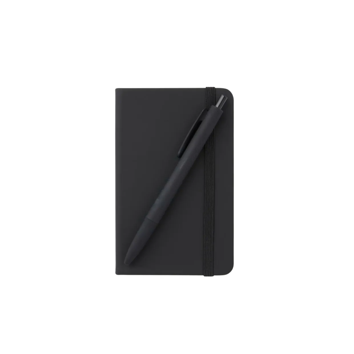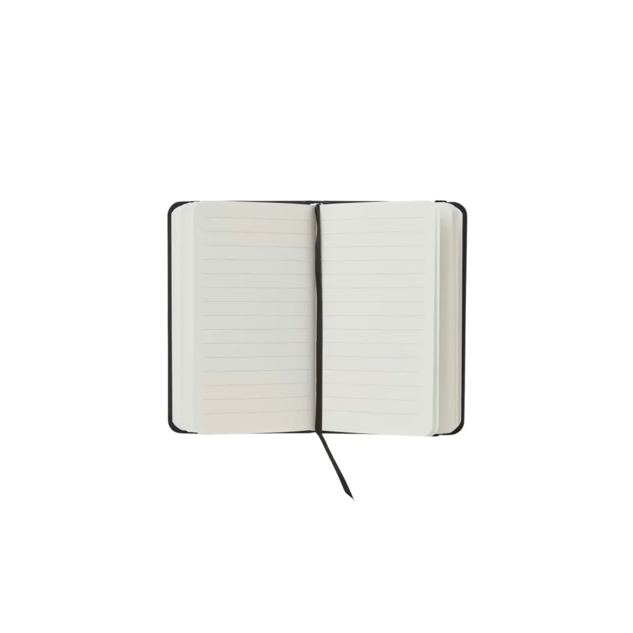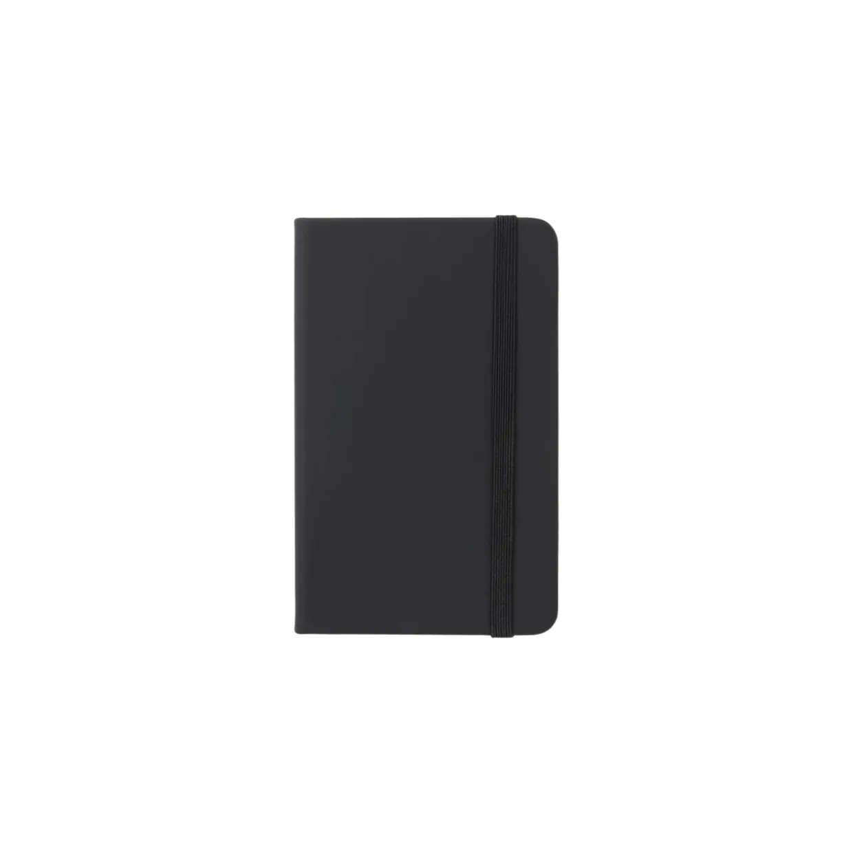Liten skrivbok klädd i konstläder med färgmatchad elastisk snodd, perfekt att ta med i handväskan eller på resan.