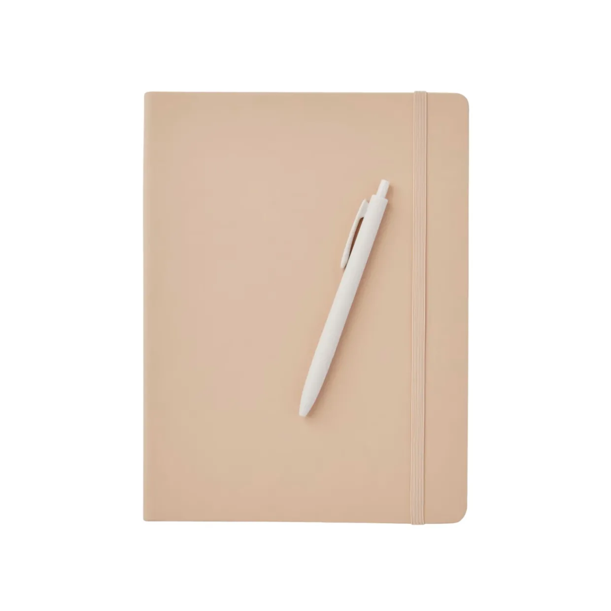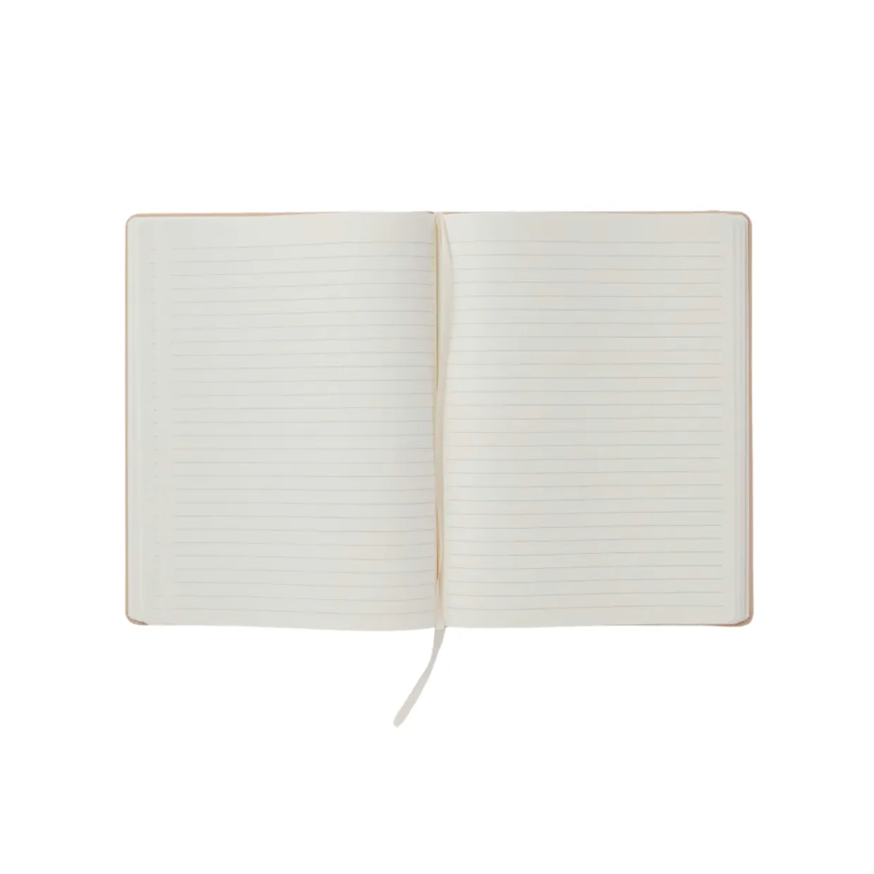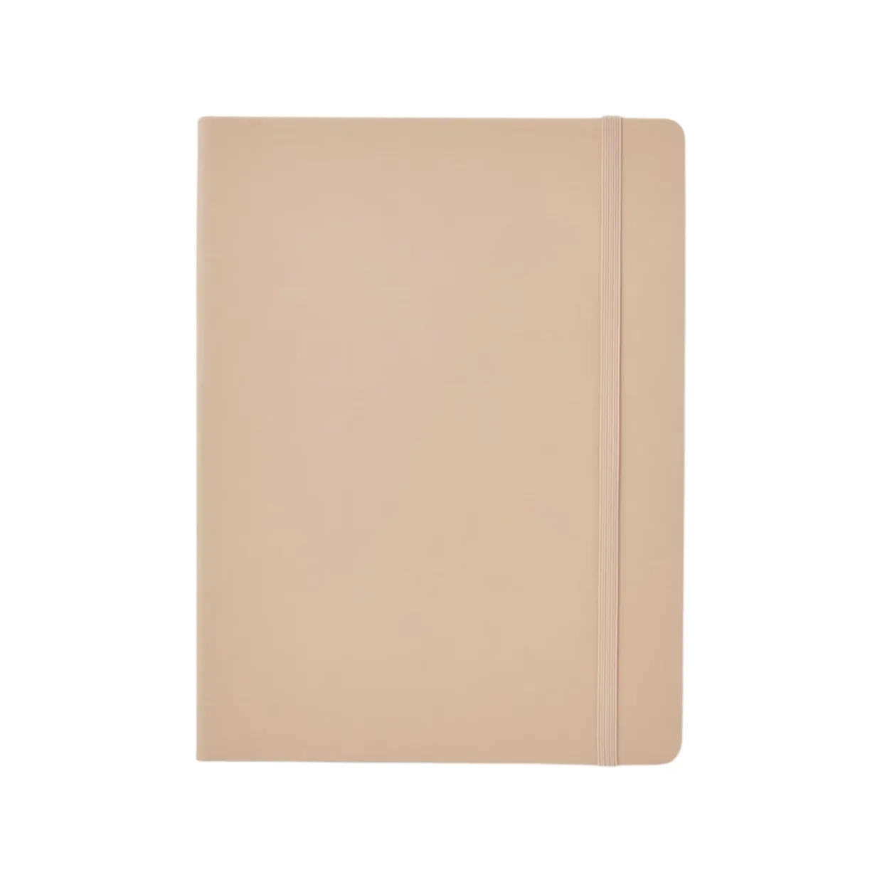 Skrivbok klädd i konstläder med färgmatchad elastisk snodd, perfekt att ta med i handväskan eller på resan.