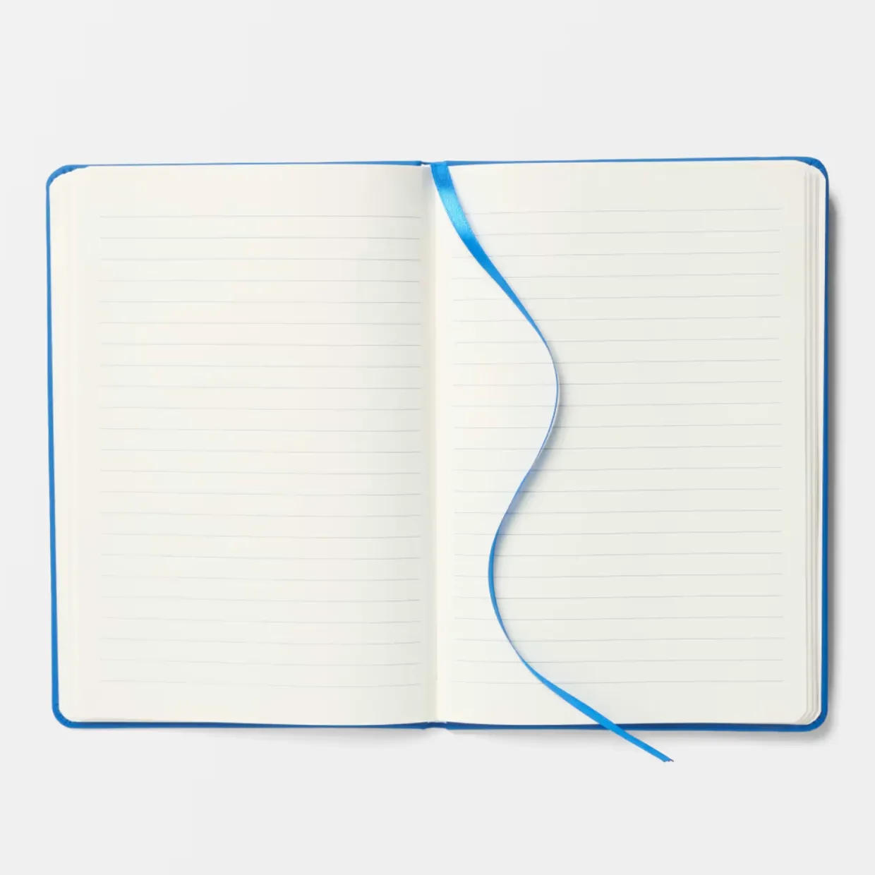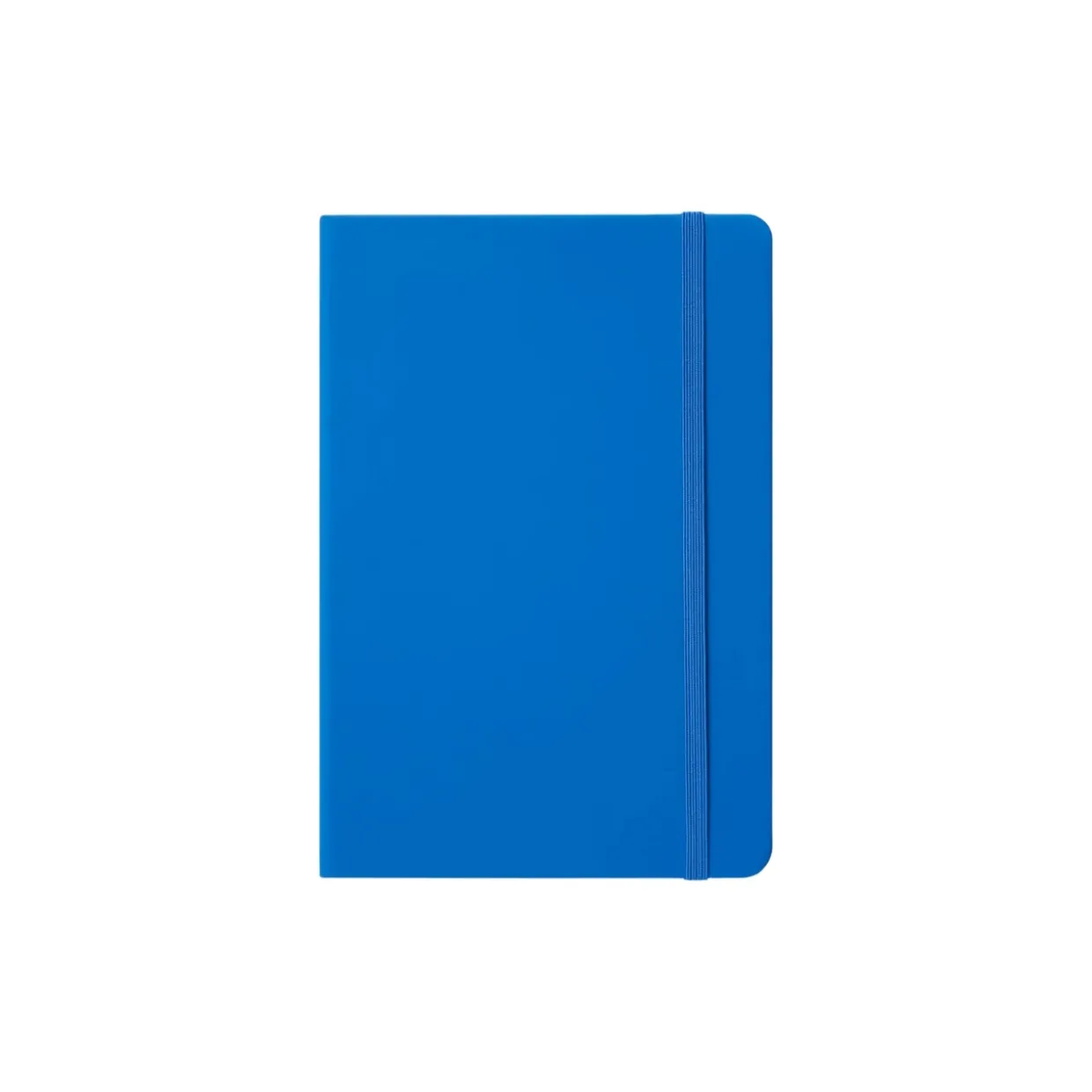 Skrivbok klädd i konstläder med färgmatchad elastisk snodd, perfekt att ta med i handväskan eller på resan.