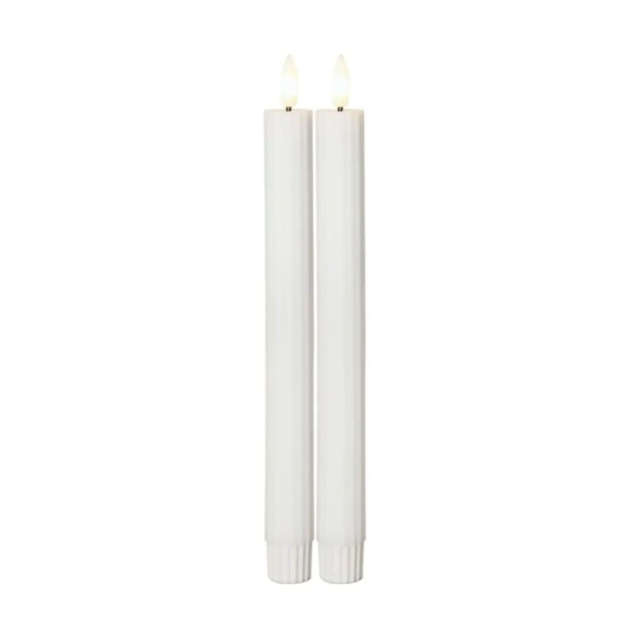 2-pack antikljus i vit från Startradings Flamme Stripe serie, gjorda i vax i med en räfflad-randig yta. Ljusen har en mycket naturtrogen låga som lyser med varmvitt sken. De har timerfunktion vilket gör att ljusen lyser i 6h per dag i ca 30 dagar. De drivs av 2 AAA batteri för varje ljus, dessa ingår ej.