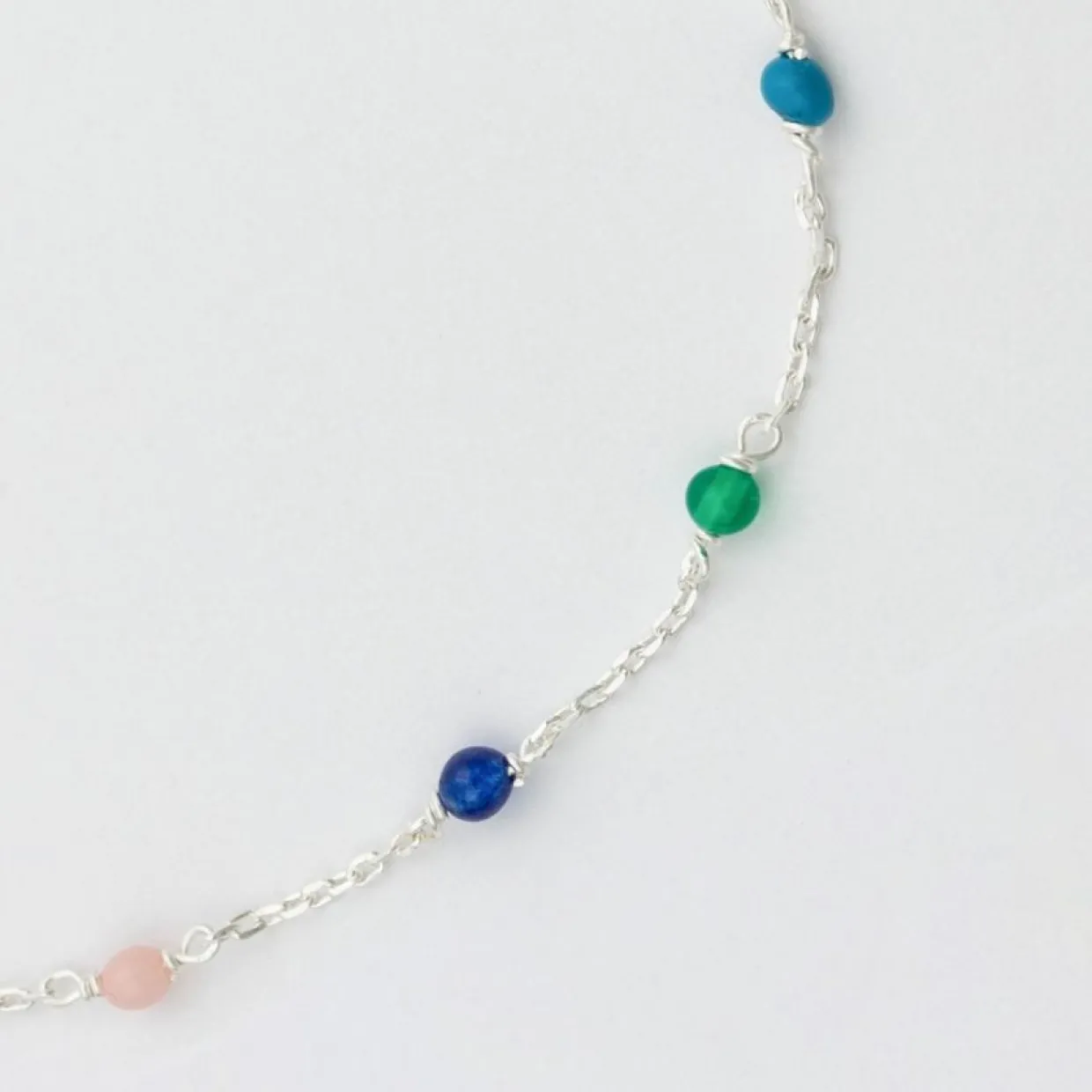 Lägg till en färgklick med detta vackra armband av 100% återvunnet silver, längd 16,5-19cm. Följande stenar ingår i armbandet: gul jade, rosa opal, sodalit, grön onyx, blå färg rekonstituerad turkos, vit agat och karneol.