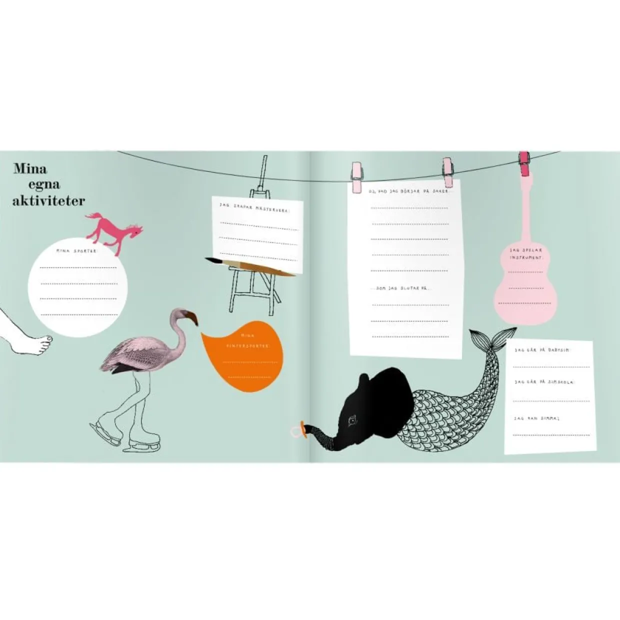 Här finns gott om plats att notera minnen och milstolpar som födseln och de första viktiga utvecklingsstegen, vad namnvalet har för historia, hur släkten ser ut och vilka favoriter barnet har bland filmer och böcker. Gott om plats finns också för anteckningar och foton.