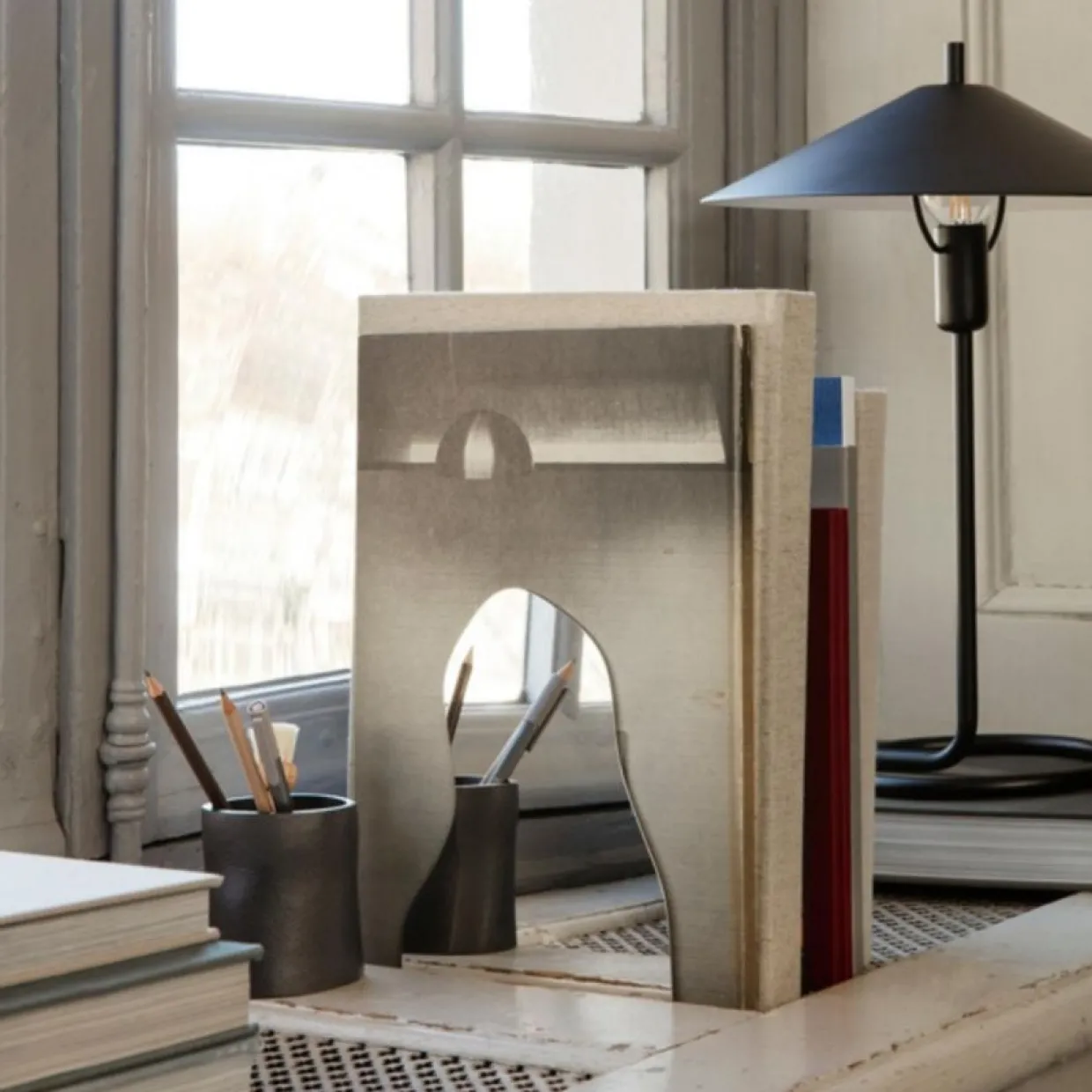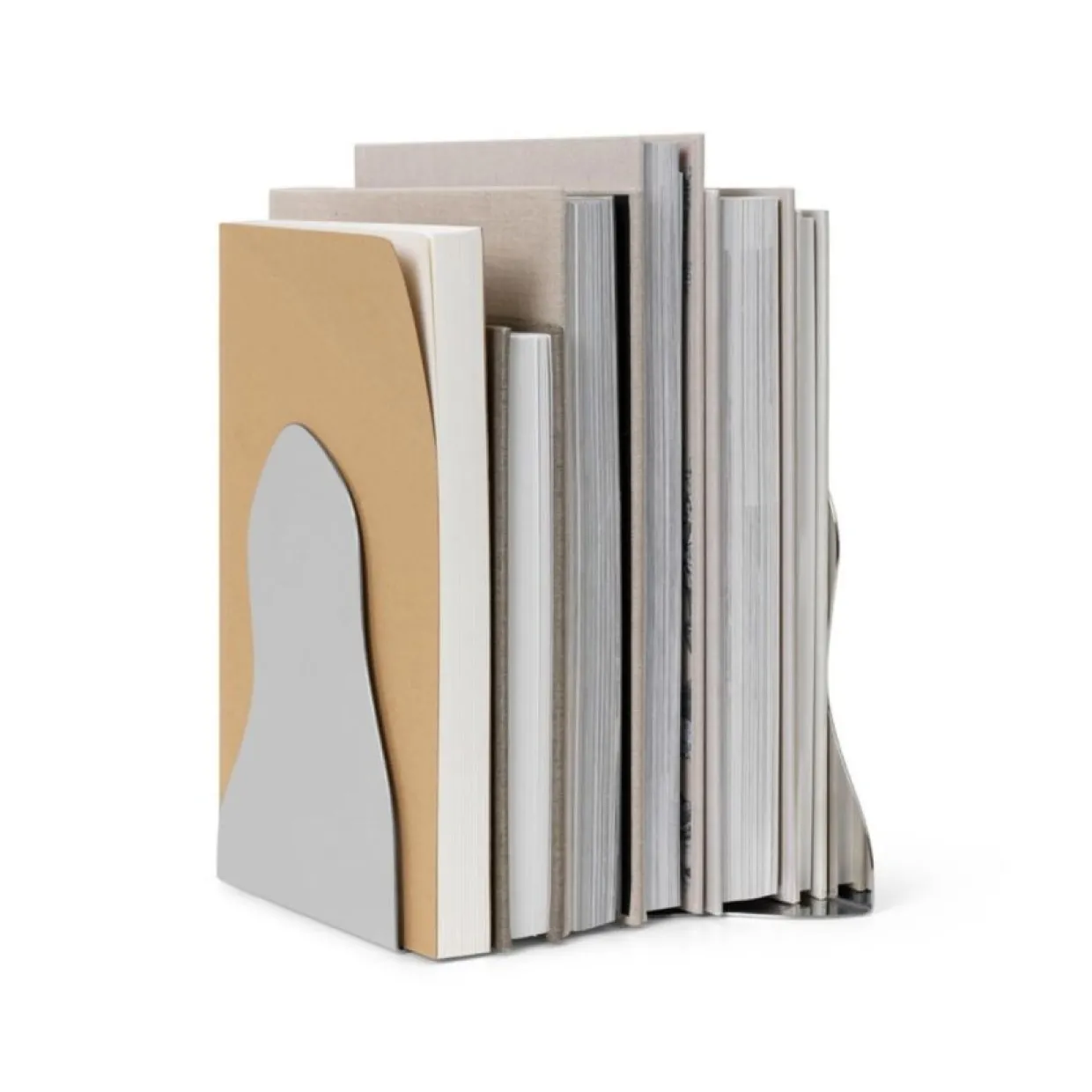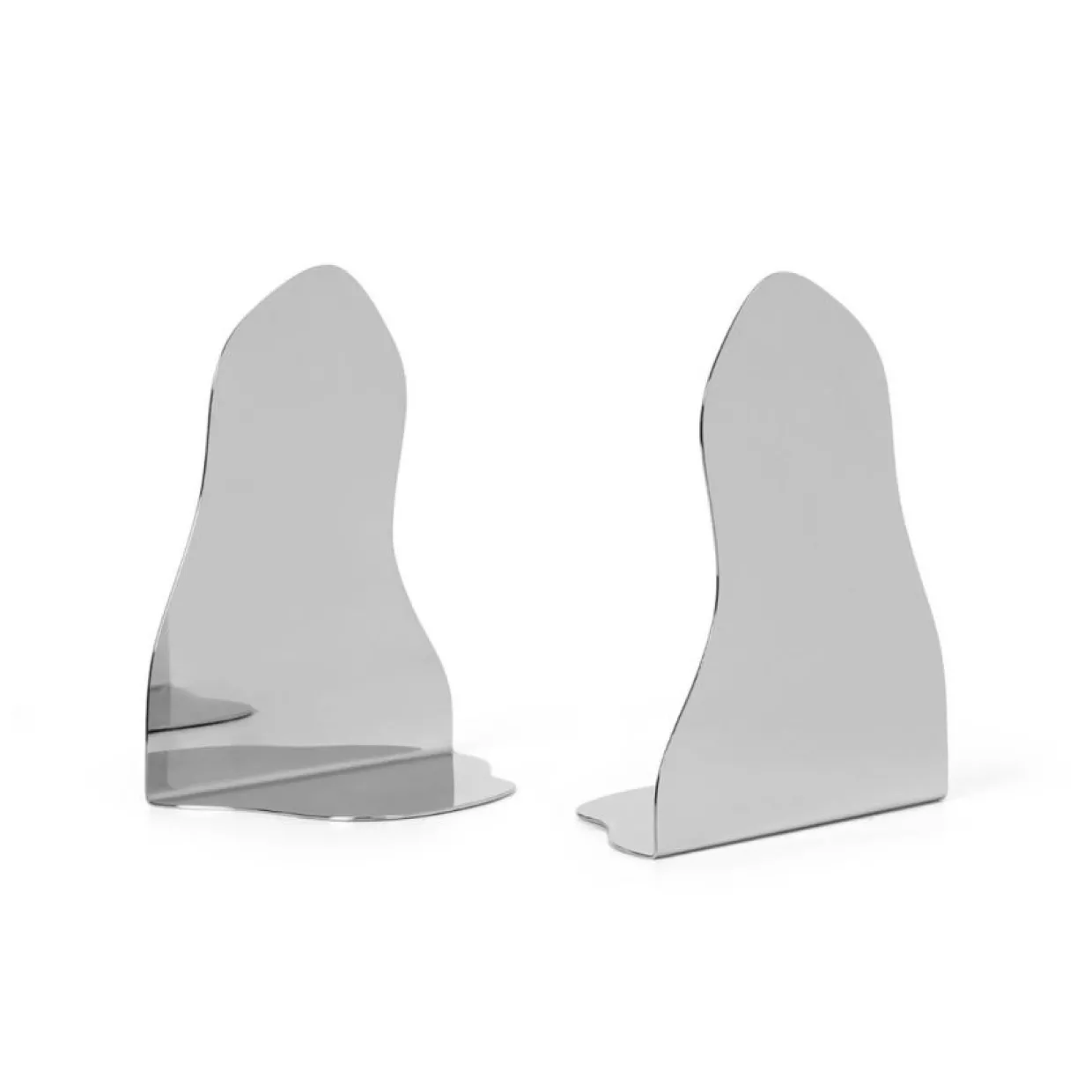Bokstöd Pond lyser upp hembiblioteket med sin flytande form och spegelvända yta. Bokstöden är en del av Pond Collektionen, där organiska former definierar uttrycket för välbekanta designstycken. Tillverkad av en böjd plåt av rostfritt stål med en spegelfinish.