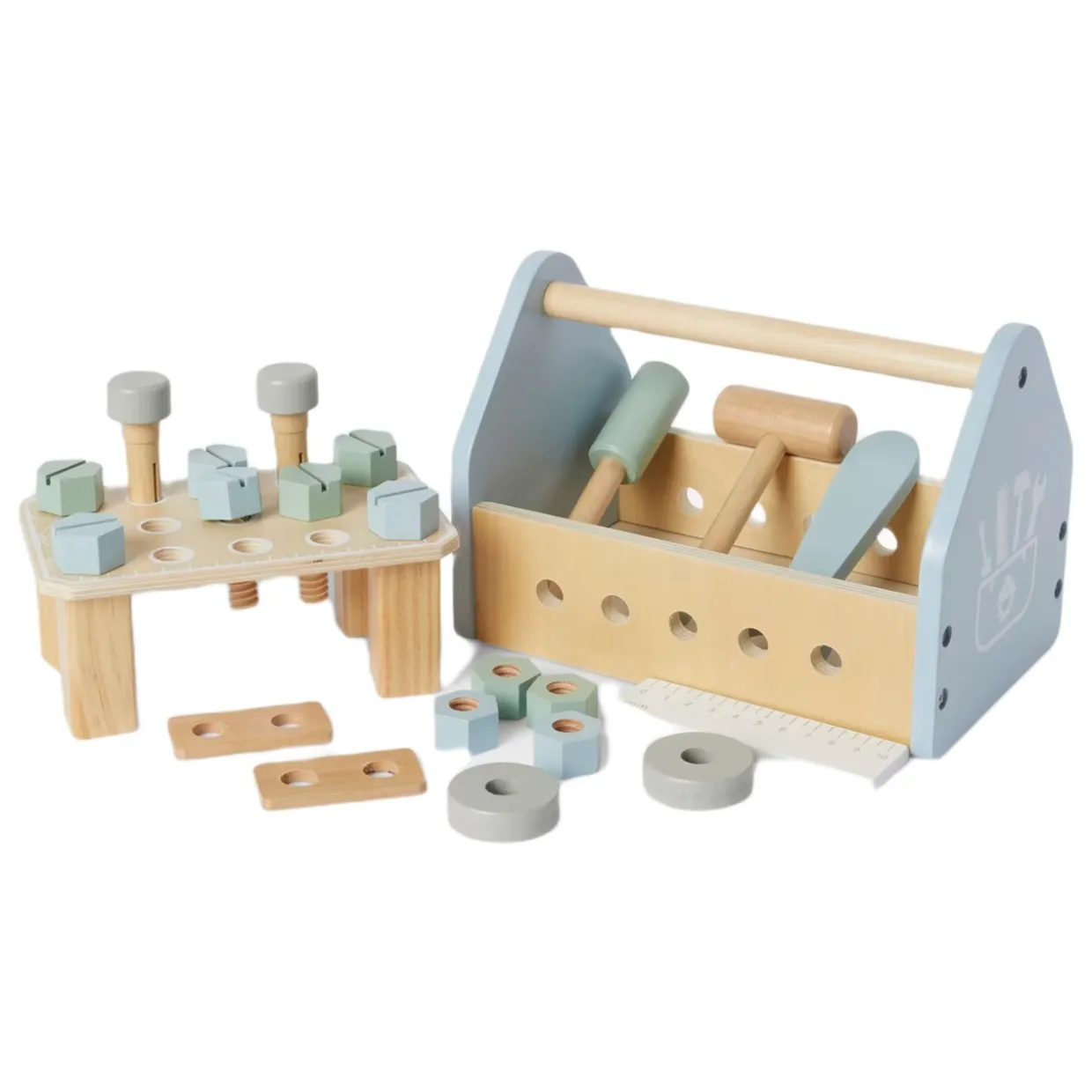 Verktygslåda i trä för den lilla snickaren. Med BOSSE verktygslåda kan barnet låta kreativiteten flöda samtidigt som finmotoriken tränas. I setet ingår en verktygslåda, en hammare, en skruvmejsel, en skiftnyckel, en linjal, en bultbräda med fyra löstagbara ben, sju skruvar, tre muttrar, två bultar, två brickor, två hålbrädor. 26 delar.