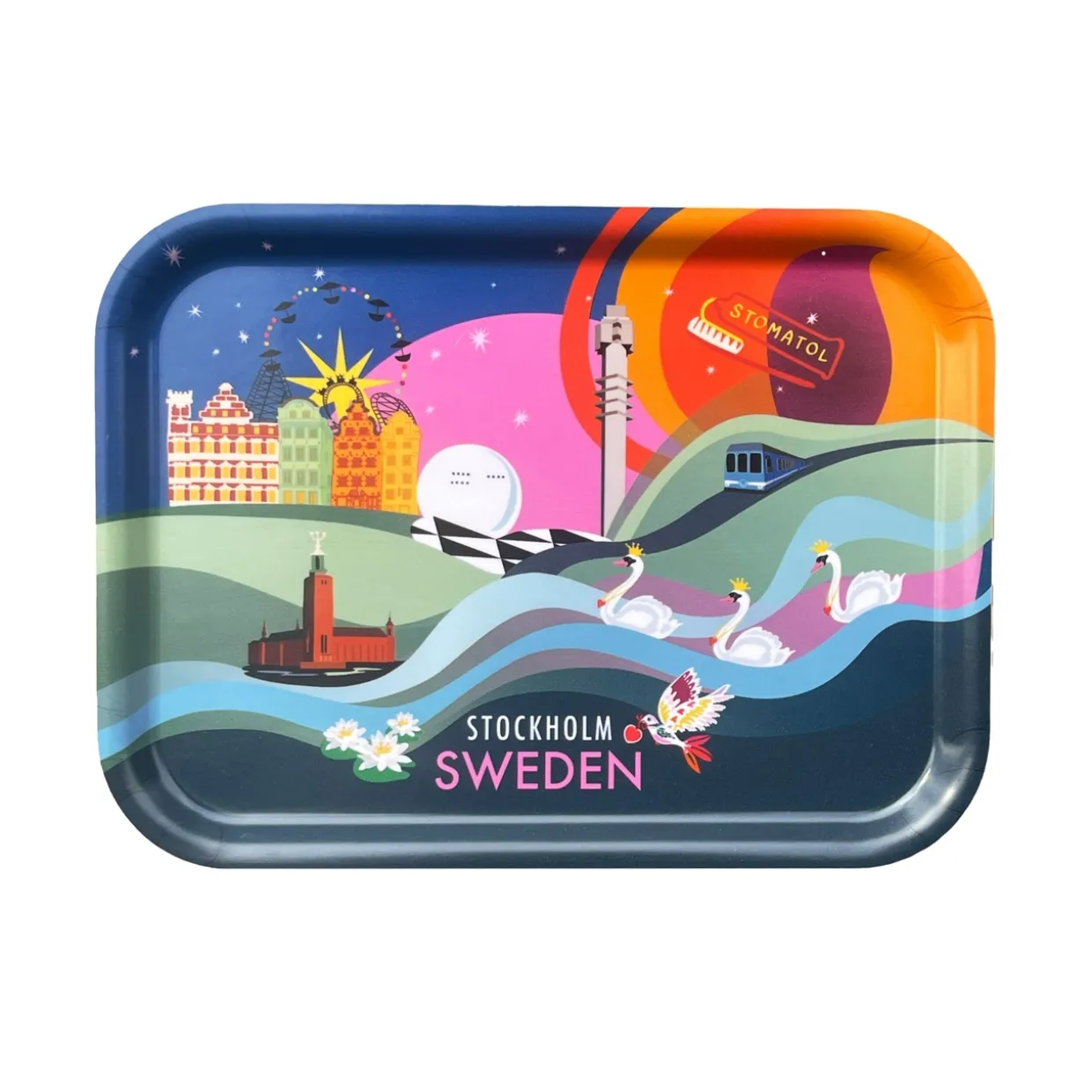 En praktisk och vacker bricka med ett färgstarkt Stockholmmotiv, illustrerat av Lottis Karlsson. Med sin lekfulla stil lyfter Lottis fram stadens unika karaktär genom noggrant utvalda symboler och detaljer som speglar känslan av Stockholm.