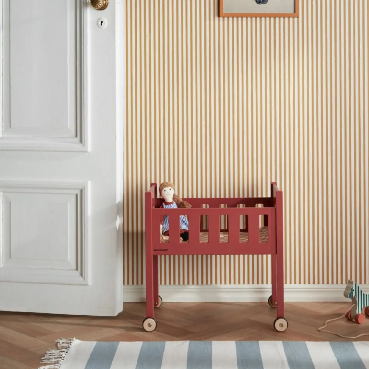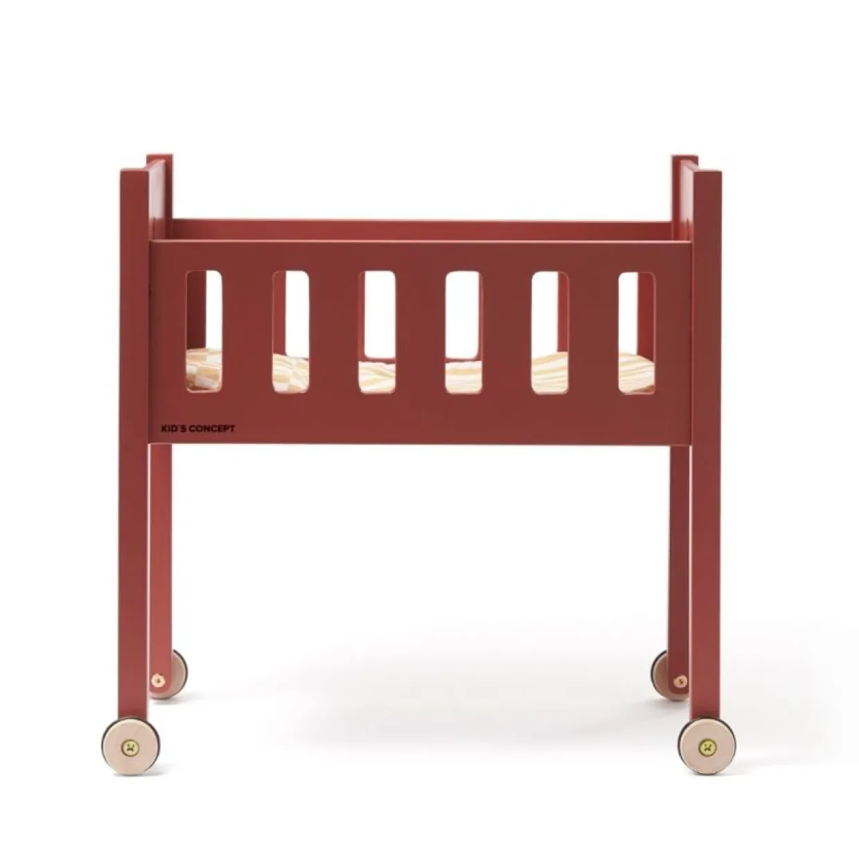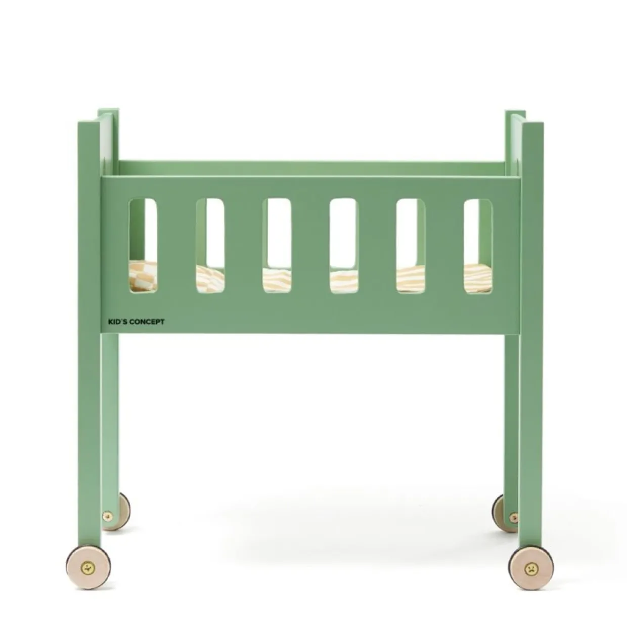 En docksäng i trä i Carl Larsson-stil med hjul med fyrklöver utskurna i kortändarna. Bäddset i bomull med tryckt mönster, där lakan och täcke är sammanfogade och inkluderar en kudde. Ränderna och ett rutigt mönster är inspirerade av Carl och Karin Larssons liv och deras sätt att färglägga sitt hem där de rutiga och randiga mönstren ofta används som basmönster. Det lilla fyrklöverspåret är inspirerat av väggmålningar och mönster som finns i deras hem. Båda har samma bäddset i en dämpad neutral gul ton. Bäddsetet har olika mönster på varje sida – ett fyrkantigt och randigt mönster som får en fin effekt när de kombineras. Carl och Karin Larsson; Fyrklövern är en populär dekoration på väggar och möbler på Lilla Hyttnäs. Det finns till och med en speciell väggmålning där fyra av barnen är avbildade i exakt en fyrklöver. Vi gillar den så mycket att vi valde att låta den bli en signatur för hela kollektionen, och alla vet att fyrklövern ger lycka till sin ägare! Lotta Hallenius, vår designer; Fyrklövern är en form som jag har sett i många detaljer i deras hem som väggmålningar och broderade detaljer. Så den här formen blev en grafisk symbol för vår Carl Larsson-kollektion. Det kan fungera som en symbol för barnfamiljen – oavsett hur familjen ser ut.